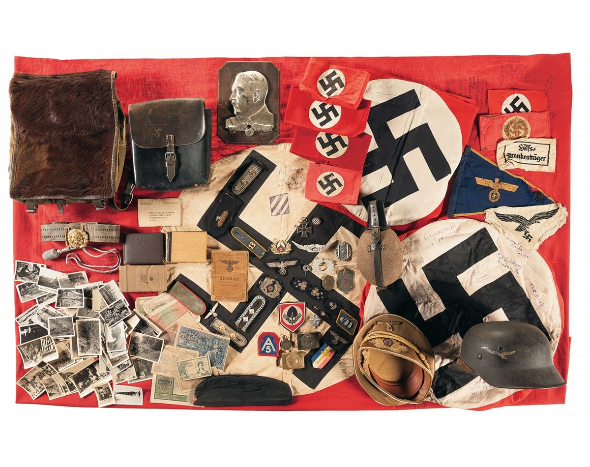 Amounts are approximate. 1 German helmet, 1 brown officer's cap (bill detached), 1 canteen, 1 box of photos and personal effects. 1 officer's personal ID, 2 nazi flags signed by GI's, 1 unsigned nazi flag, a leather pouch and a horsehair pack. 7 arm bands, 1 leather strap, 1 metal Hitler bust on a wood plaque, 1 Hitler Youth cap and 1 green zippered sash. A Kriegsmarine officer's dress belt and buckle, 1 Kriegsmarine staff car pennant, 1 Luftwaffe medal and a Iron Cross, 2nd class. 1 1938 council badge, 1 physical training shirt emblem, 2 belt buckles, Kreigsmarine patches and a Kreigsmarine hat pin. 1 Luftwaffe hat emblem with cockade badge set, cockade and gold wound badge. 1 nazi party pin, 2 silver wire eagle patches and a German national labor service emblem. 1 X Flottiglia Mas shield, 1 Italian fascist badge, miscellaneous epaulets, miscellaneous currency and merchandise claim list issued to the GI who brought back the collection from the war. The overall condition fair to good showing the effects of age and wear.