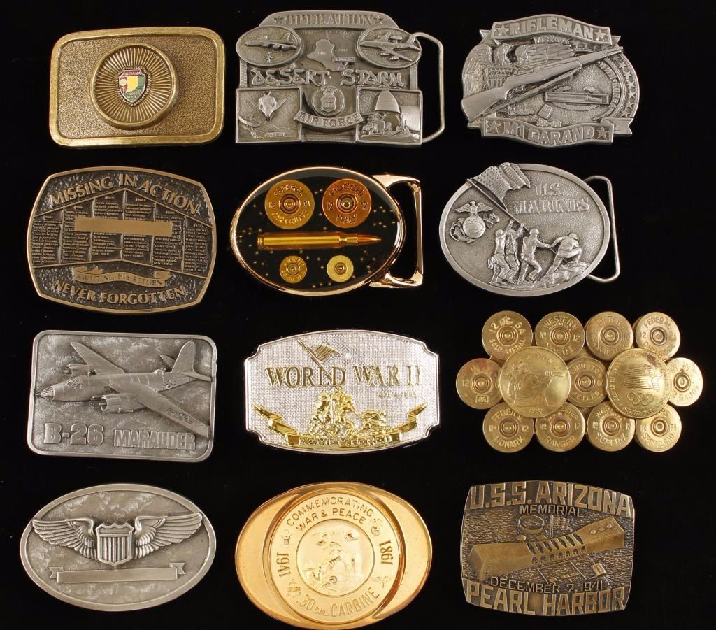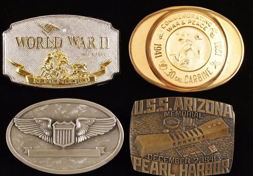 Pearl Harbor, WWII, U.S. Marines, Vietnam, Rifleman, Desert Storm and many more. Some brass, some silver metal.