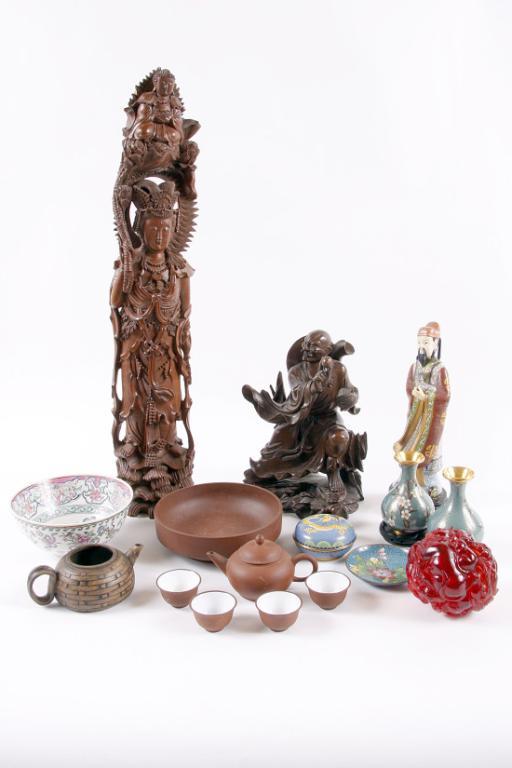 Large Lot of Miscellaneous Asian Items including a cloisonne figurine of a man, an older cloisonne b