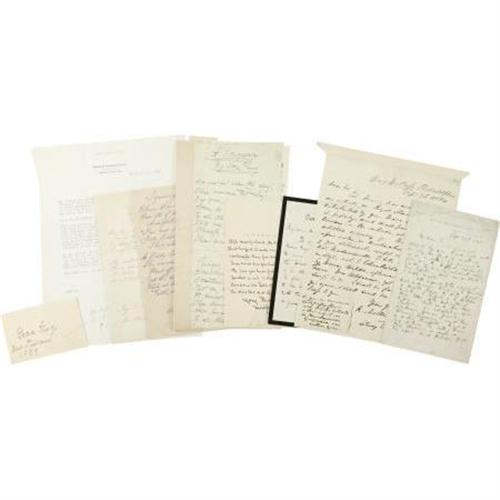 <B>Large Lot of Miscellaneous Author’s Signatures, Letters, and Poems</B></I>. A diverse lot with a common literary theme of the famous and forgotten. Each specimen is unique in terms of size and medium but generally consist of autograph letters, typed letters, poems, quotes, etc. Included in the lot is a Grace King signature, George Fielding Eliot typed letter signed, Caroline H. Dall autograph poem, Charlotte Fisk Bates autograph poem, Nora Perry autograph poem, Mary Devereux autograph poem, Herbert Spencer ALS, H. Shelton MacKenzie ALS, Justin McCarthy ALS, Seth Low ALS, Ella Wheeler Wilcox signature, C. F. Adams, Jr. ALS, Robert Palfrey ALS, Florence S. Barclay ALS, and John Fitzpatrick AQS. All examples in very good or better condition, with some mounting remnants on the verso. <I>Ex. Henry E. Luhrs Collection</B></I>.<BR><BR><BR><b>Shipping:</b> Flat Material, Small (<a target="_blank" href="http://www.heritageauctions.com/common/shipping.php">view shipping information</a>)