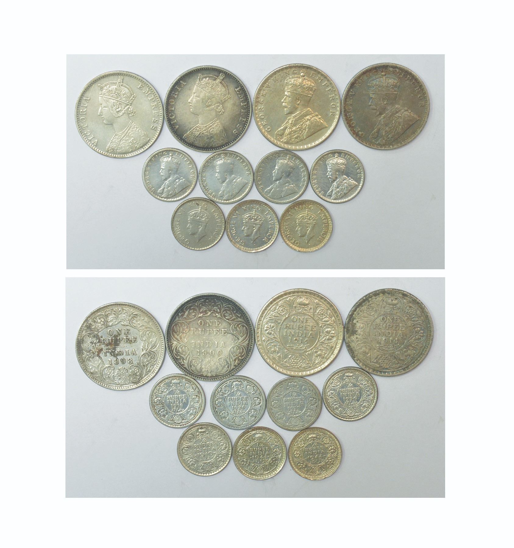 A group of 11 British India, silver & half silver coins, 4x rupee, includes date 1898, 1900, 1914 and 7x ¼ rupee, includes date 1918, 1919, 1926, 1936 and 1940, 1944. (11 coins)