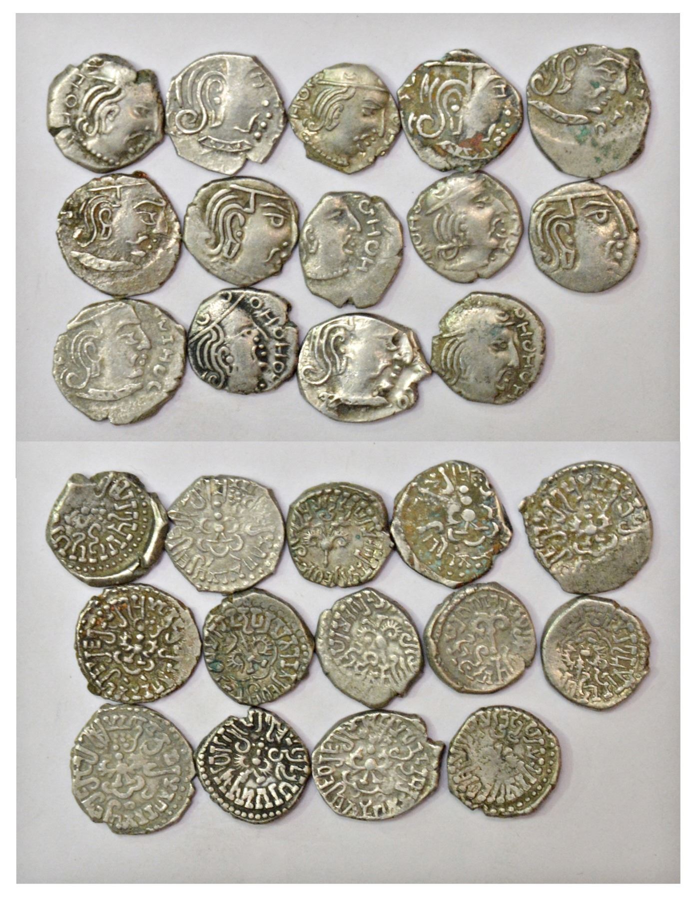 A group of 14 Gupta silver coins, mostly Kumar Gupta, garuda & peacock type. (14 coins)