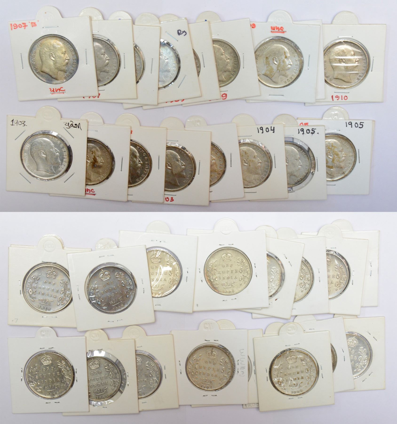 Large Lots: A group of 19 Edward VII silver rupee, includes 1903 (4), 1904 (2), 1905 (2), 1906, 1907 (2), 1909 (5) and 1910 (3), Bombay and Calcutta mint, various types. (19 coins)