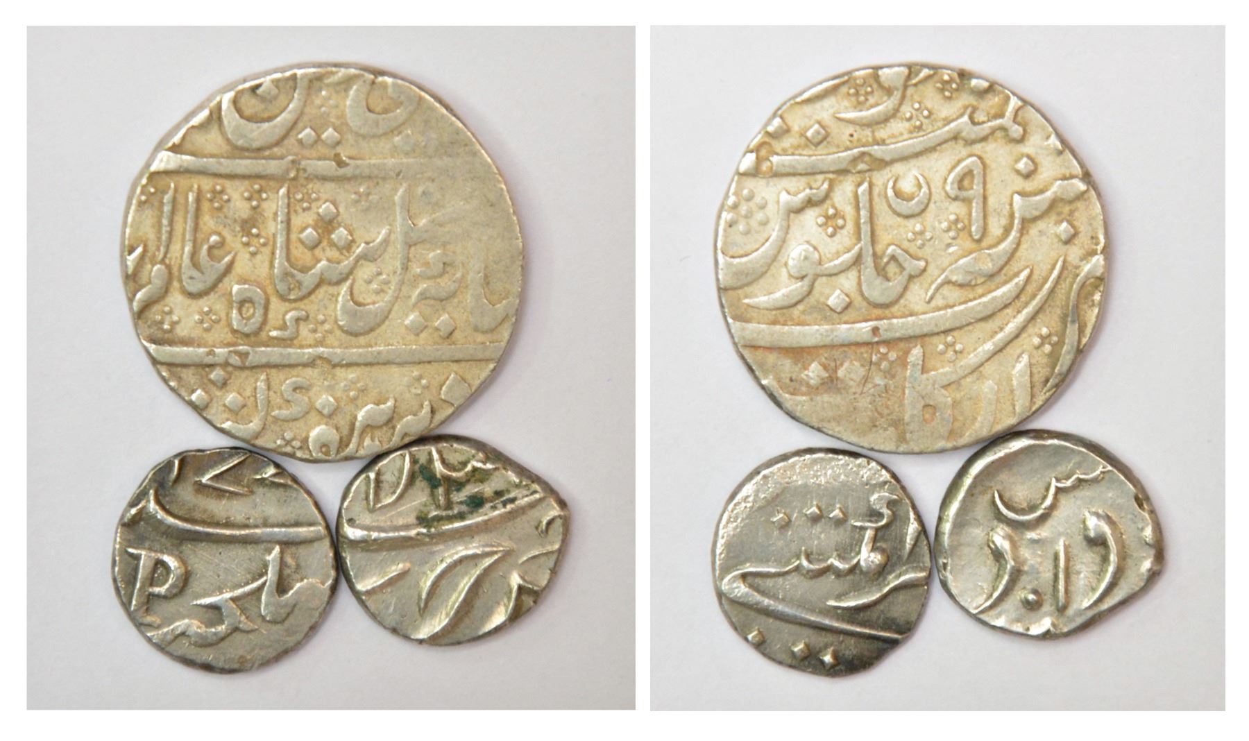 A group of 3 Indo-French, silver coins, 1x rupee, Arkat mint & 2x 1/5 rupee, Phulcheree mint. (3 coins)