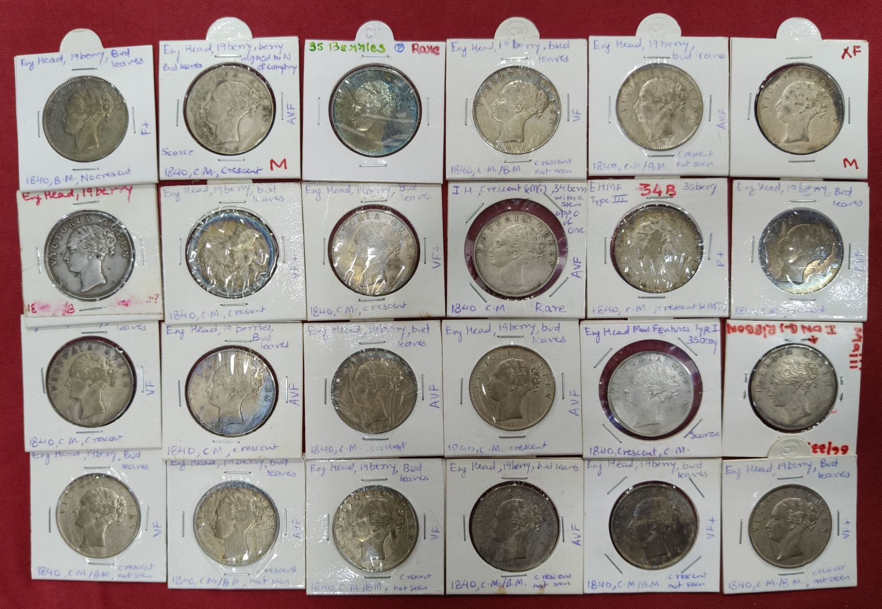 Large Lots: A group of 46 Victoria Queen silver rupee, all dated 1840, continuous legend, various mints and types. (46 coins)