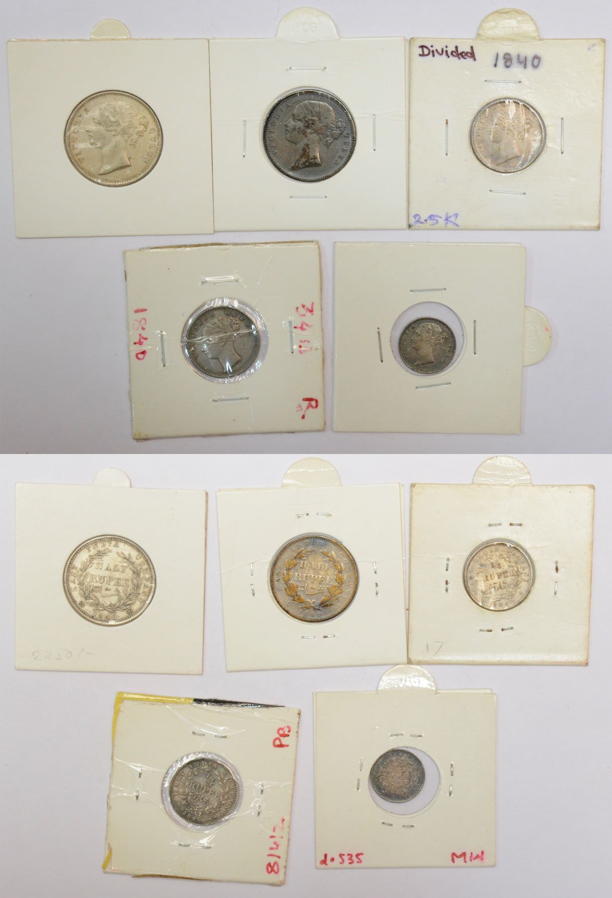Large Lots: A group of 5 Victoria Queen silver coins, includes continuous and divided legend, 4x 1840, ½ rupee (2), ¼ rupee (2) and 1x 1841, 2 annas, various mints and types. (5 coins)