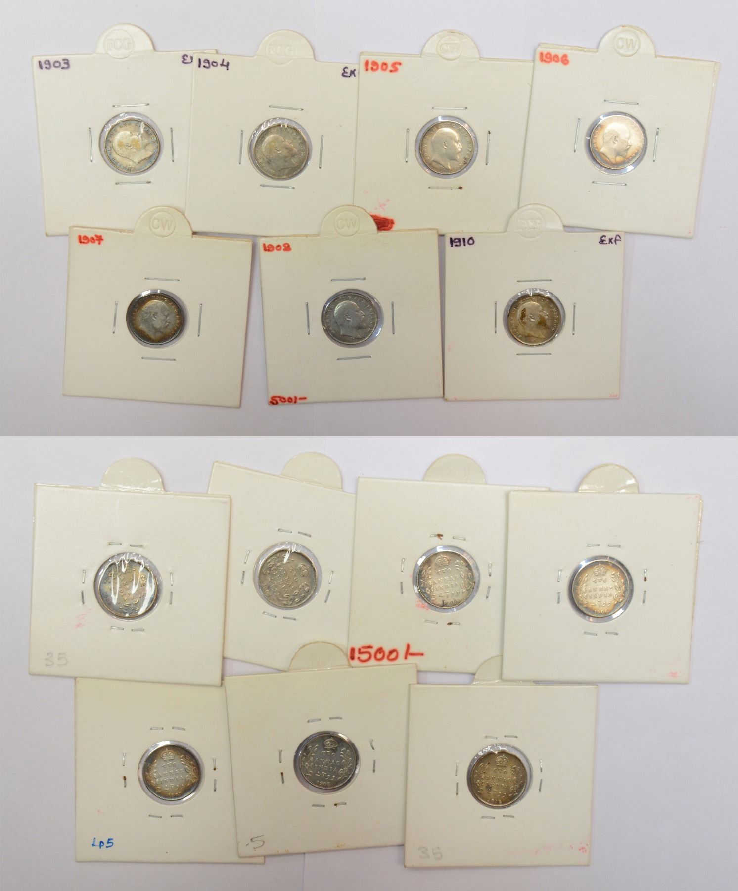 Large Lots: A group of 7 Edward VII silver 2 annas, includes 1903, 1904, 1905, 1906, 1907, 1908 and 1910, Calcutta mint. (7 coins)