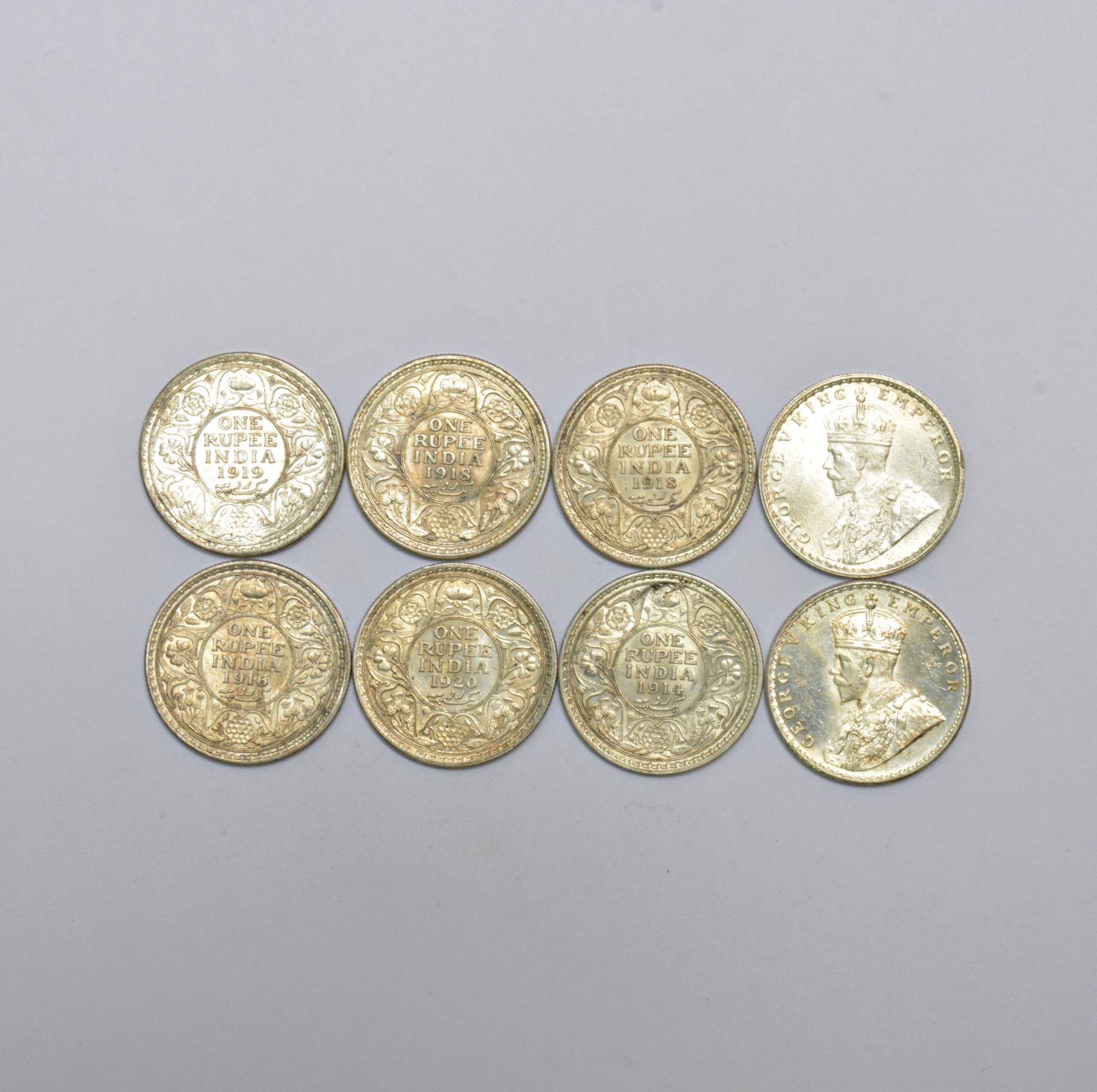 A group of 8 British India silver rupee, includes date 1913, 1914, 1916, 1918, 1919 and 1920. (8 coins)