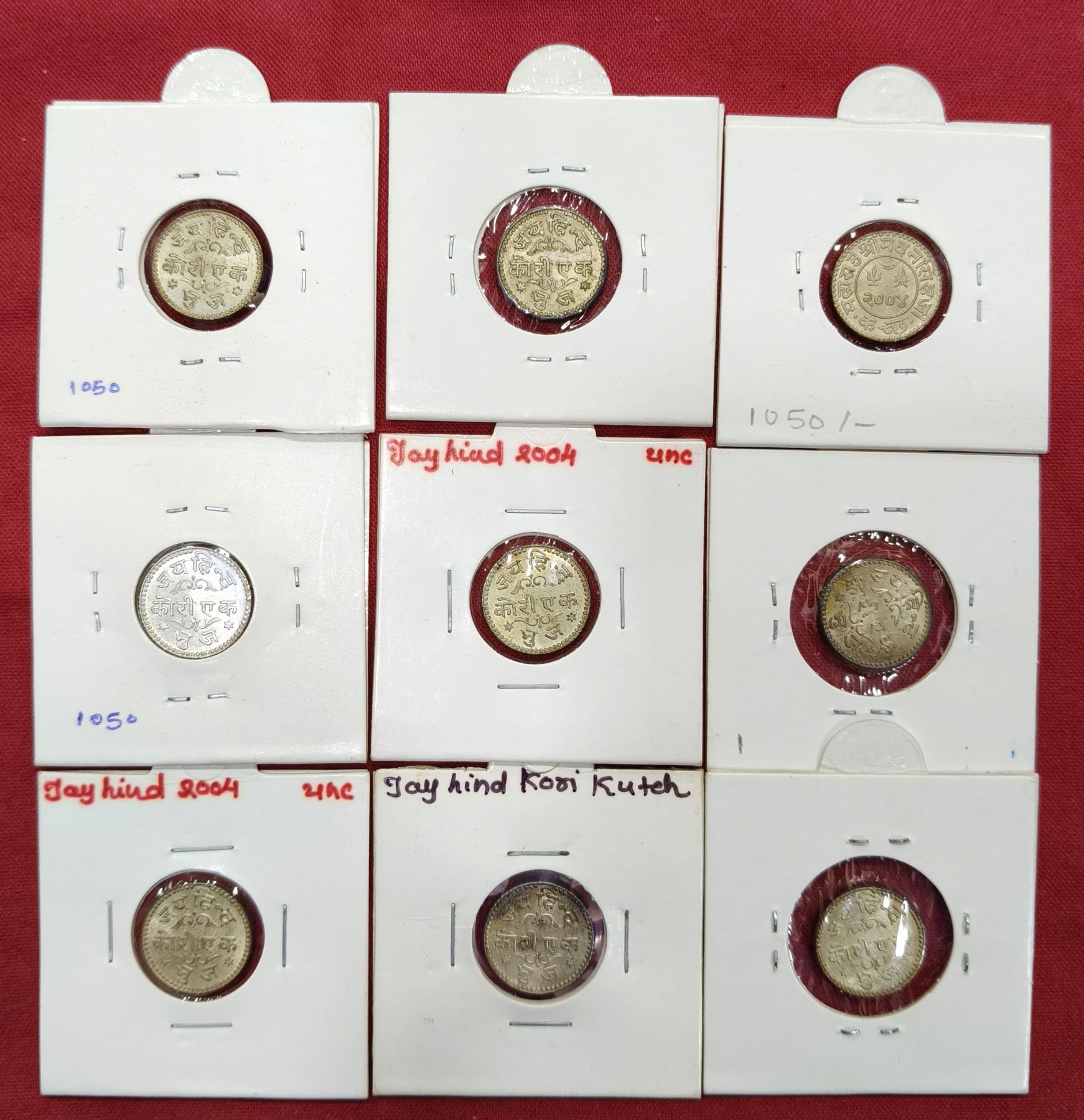 Large Lots: A group of 9 silver Jay hind kori of Madansinghji, all dated VS 2004. (9 coins)