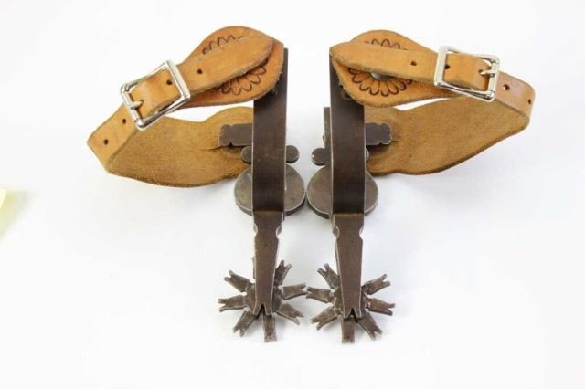Large Lytle and Mower spurs, single mounted3/4" heel bands, 2 1/4" straight shanks, 8  point rowels, floral carved straps by D&D  Tucson, AZ, marked L&M on shanks.  Est.  600-1200