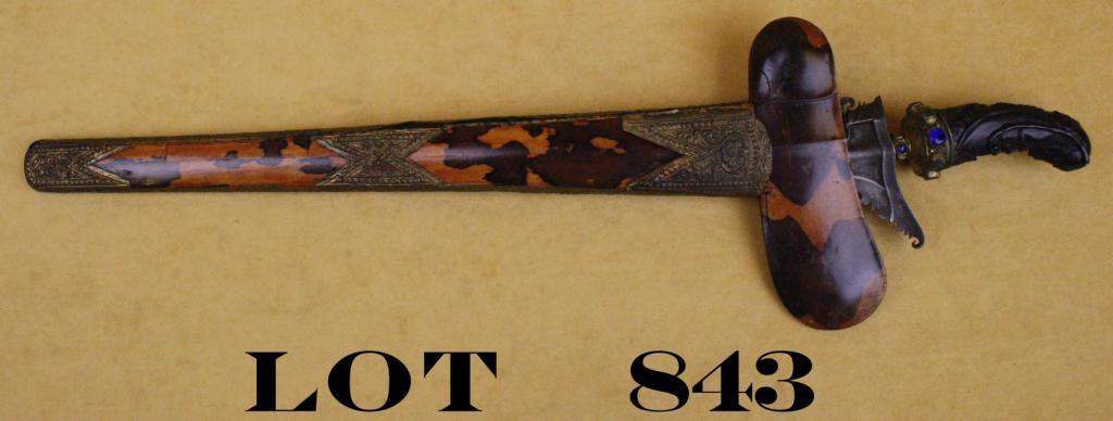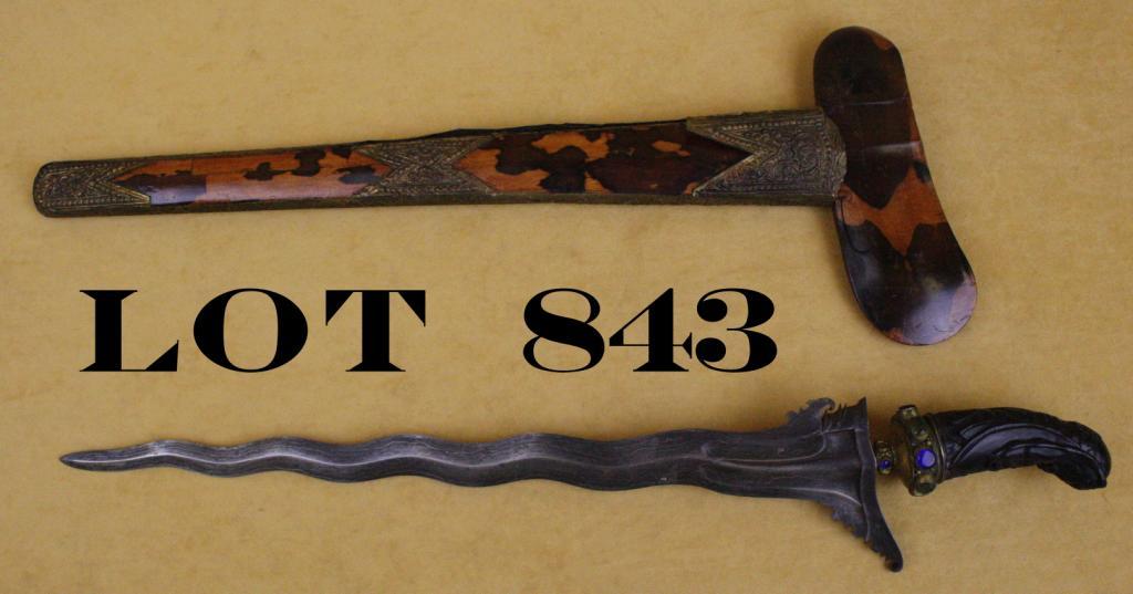 Large Malayan Kris with classic style wavy blade, jeweled grip base with carved wood grip, approx. 21-1/2” overall with an approx. 17” blade in overall good condition with wood sheath that is trimmed in stamped thinbrass mounts that have detached in several places and can be easily re-glued. Est.: $150-$300.