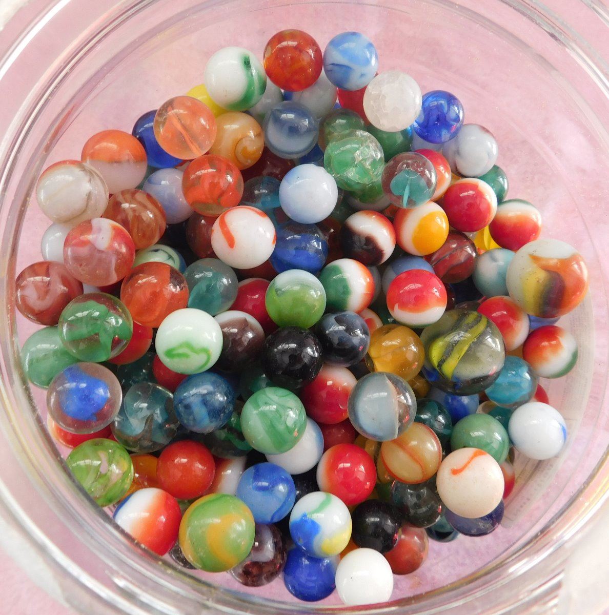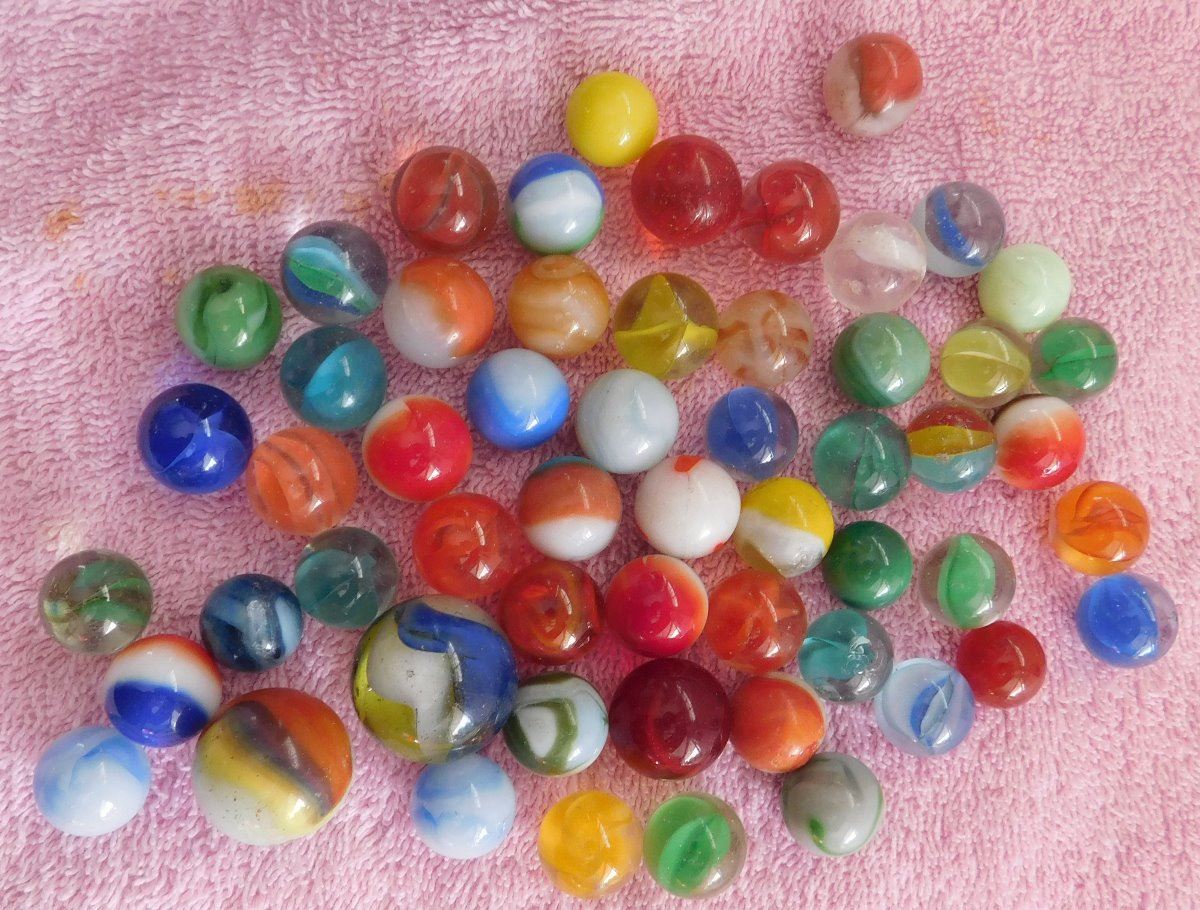 Large Marble Collection, from WWI to WWII. Made of glass, the items are 1/2" to 1" each. USA. Nice, old collection of 1, 2 and 3 color marbles. Condition: Good, see images. Shipping: $20.00 w/insurance and signature.