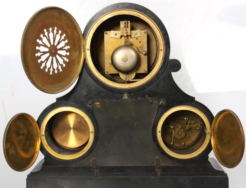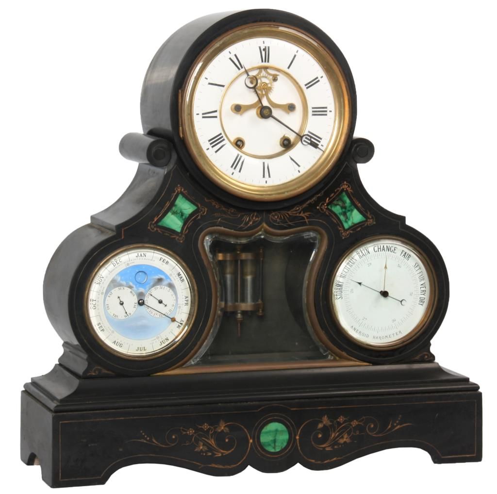Large Marble Triple Dial Mantle Clock. Inset 6.5 in. porcelain dial has a convex chapter ring with black Roman hour numerals, black open moon hands and exposed Brocot escapement with steel pallets, strikes on a steel bell and has a brass door bezel with beveled glass; the 4.5 in. lower left dial is a perpetual calendar indicating the Day, Date, Month & Moon Phase, the lower right dial is an Aneroid Barometer and between the two dials is a large beveled glass panel which exposes the 2 jar mercurial pendulum. In a large black marble case with inlaid green marble and gilt incised highlights on the front. Time and calendar mechanisms are in good running condition, strike is not working. 20.5 in. high x 20 in. wide x 6.5 in. deep.