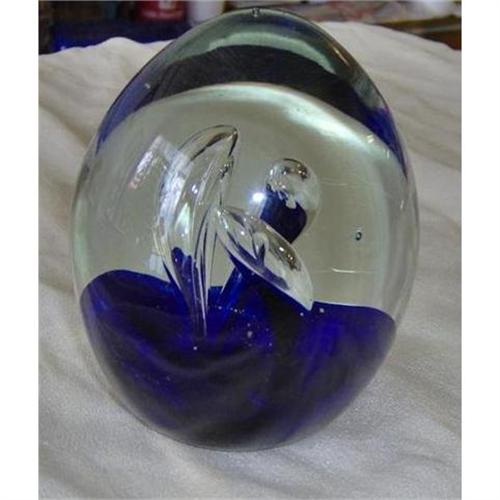 This large paperweight mixes cobalt and crystal in its striking presentation. Cobalt blue results from adding cobalt oxide, a silver-white metal, to the glass. The resulting design brings to mind dolphins at play, as they splash through the water! It is 4 1/2 inches tall, 3 1/2 inches wide, and has a 1 7/8-inch bottom. Its size and weight give it a capacity to truly do its job!