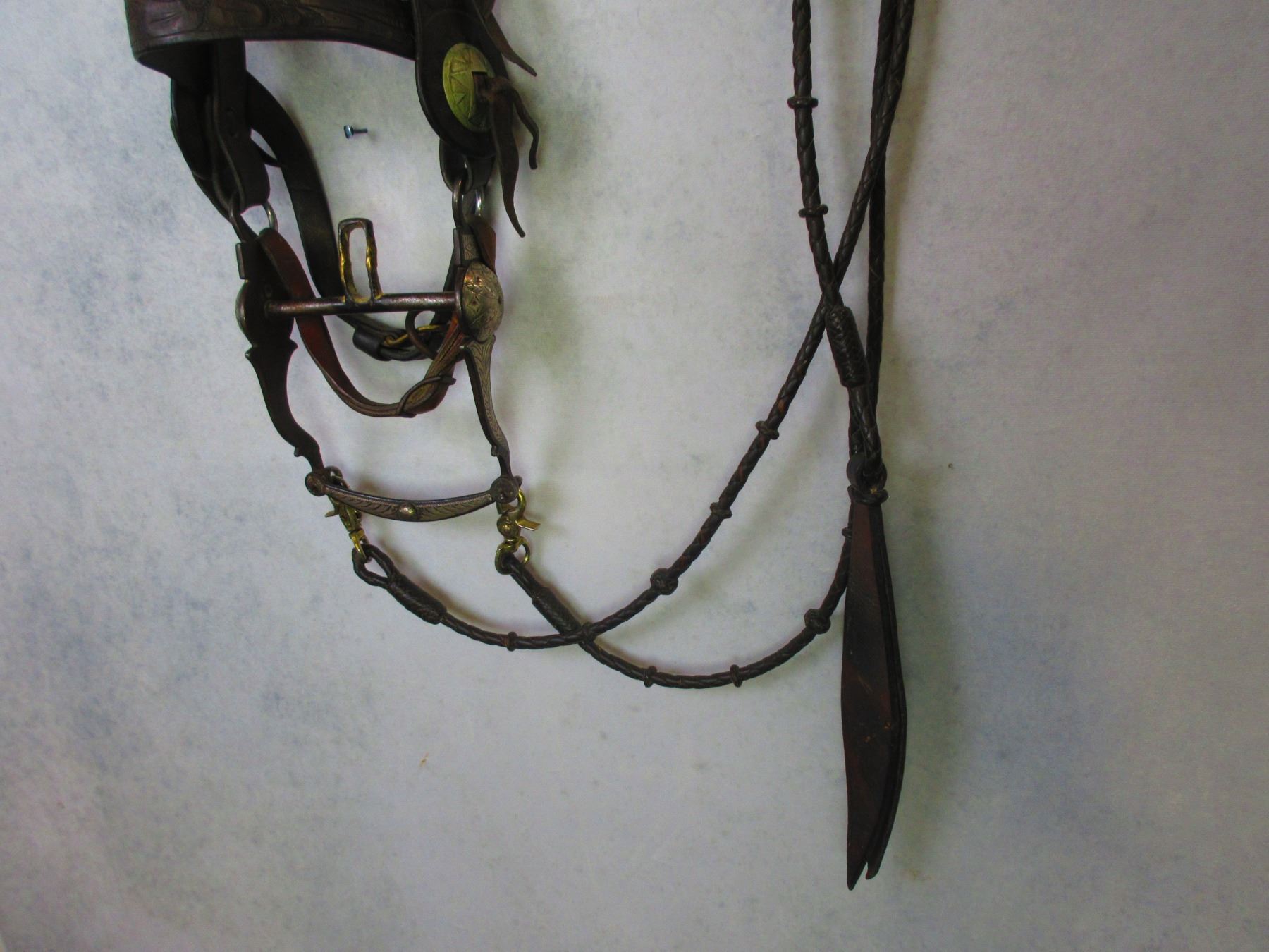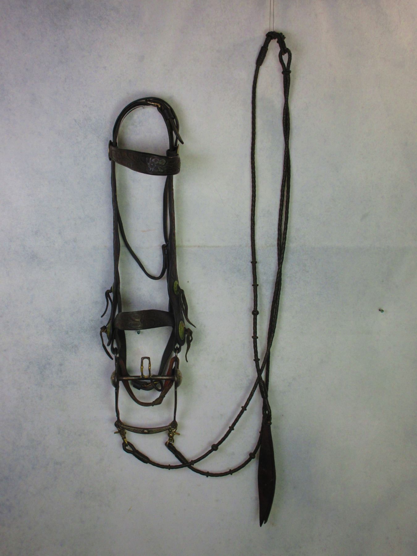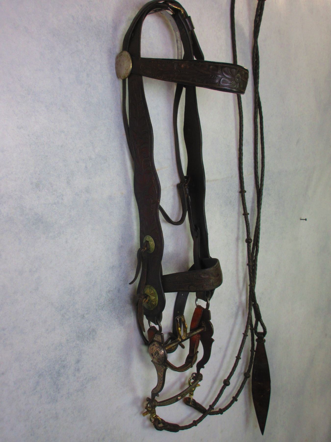 Large Marked Heiser Denver Browband Flower Tooled Headstall- Nickel And Iron Conchos- 5 Dot Marked Hernandez Silver Inlaid Bit- Arizona Cheek- Halfbreed Mouth (Missing Roller)- Slobber Bar ( Missing Caps)- Leather Romal Reins- Good Condition Headstall