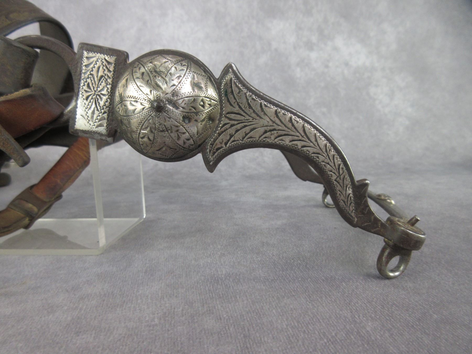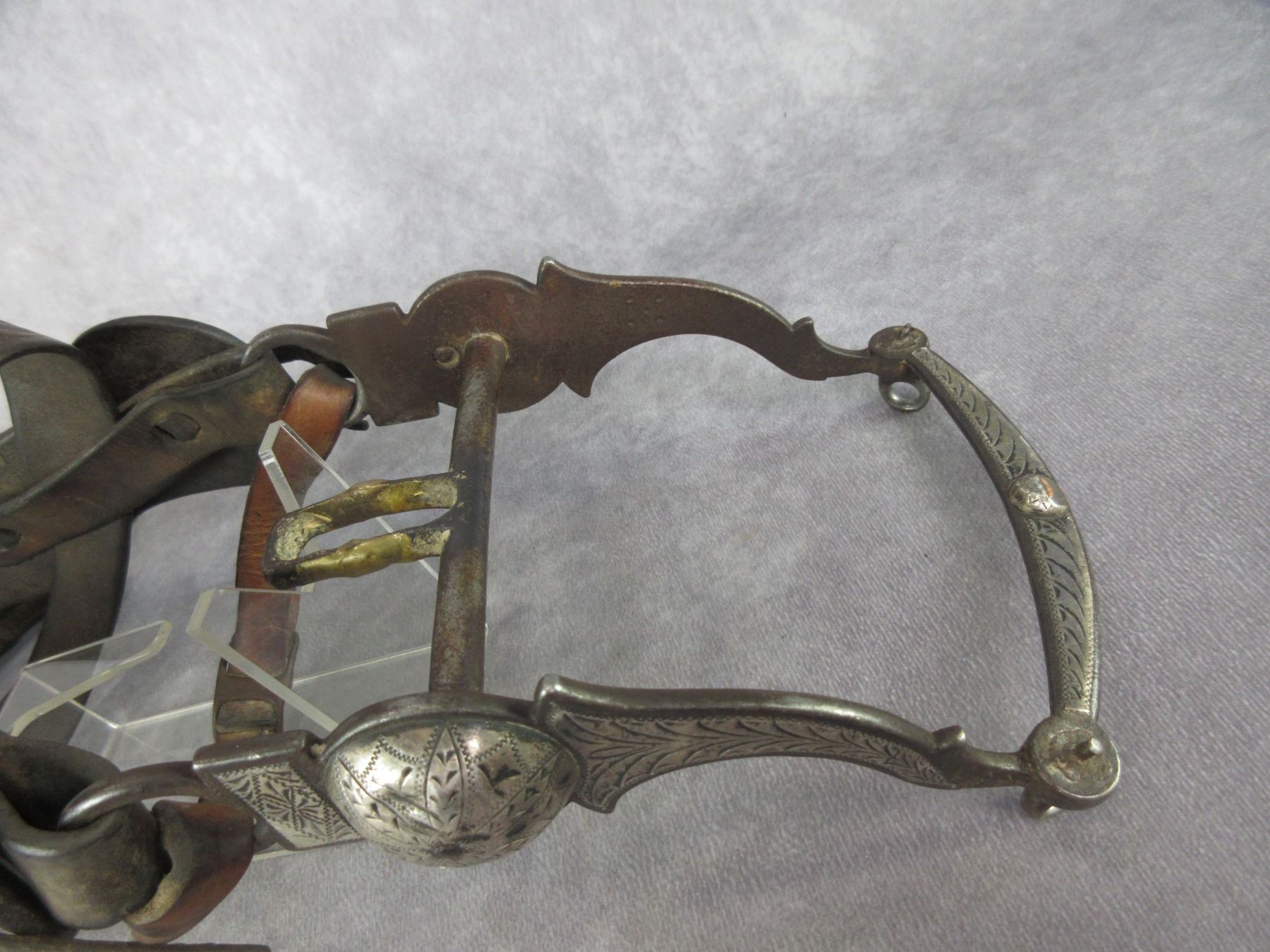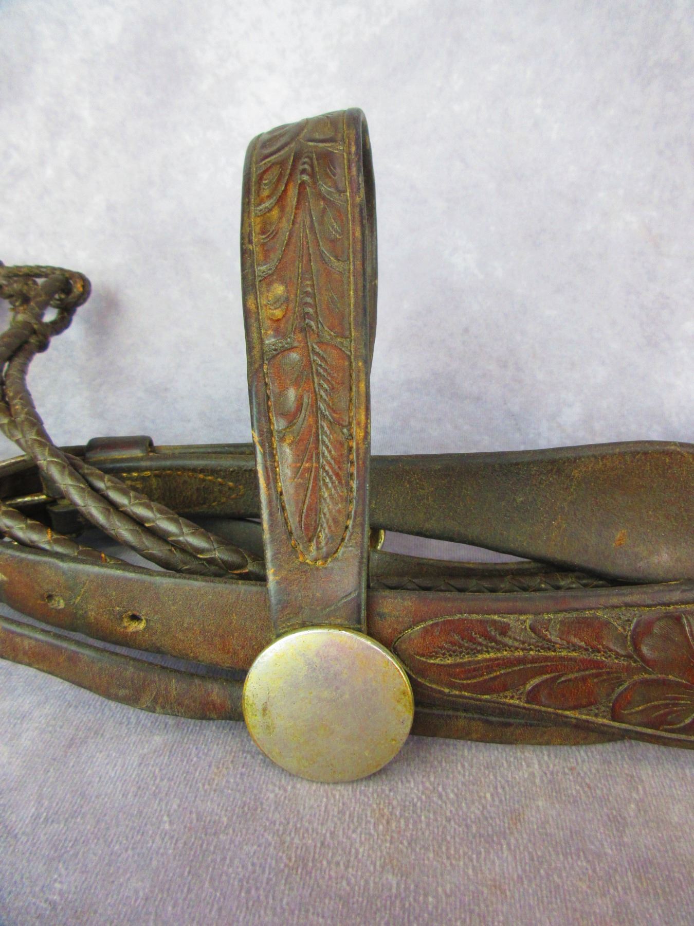 Large Marked Heiser Denver Browband Flower Tooled Headstall- Nickel And Iron Conchos- 5 Dot Marked Hernandez Silver Inlaid Bit- Arizona Cheek- Halfbreed Mouth (Missing Roller)- Slobber Bar ( Missing Caps)- Leather Romal Reins- Good Condition Headstall