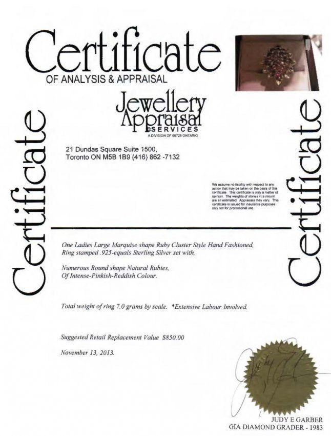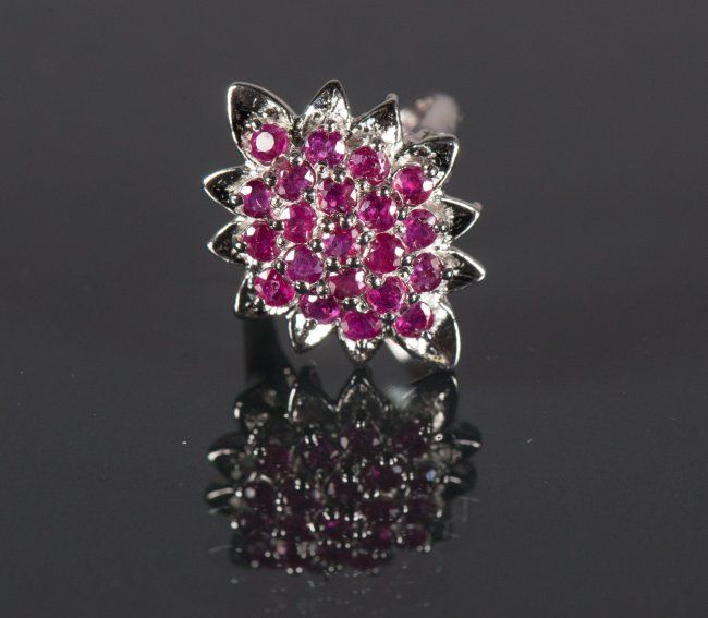 One ladies large marquise shape ruby cluster style hand fashioned ring stamped .925-equals sterling silver set with numerous round shape natural rubies; suggested retail replacement value: $850; accompanied with Certificate; H: 2.5 cm, W: 2.2 cm, D: 2 cm, 7 grams