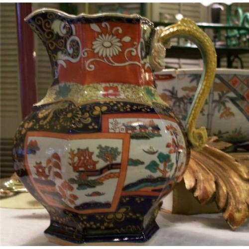Offered here is a large and impressive Mason's jug in the Double Landscape pattern, dating to around 1850. It has the dolphin handle and more or less a hexagonal shape. The enameling is bright and sharp and I find the jug to be in excellent condition with no cracks or repairs. There is light wear consistent with it's age on the bottom. On the lip and handle there is just the very lightest wear to the to the enamel but no roughness. The jug measures 9" in height.