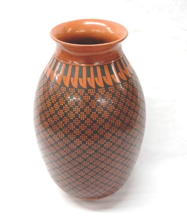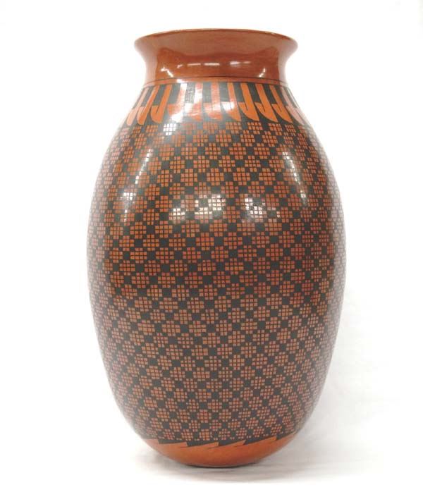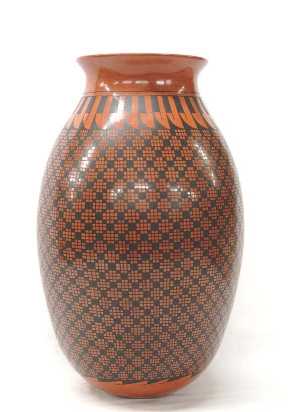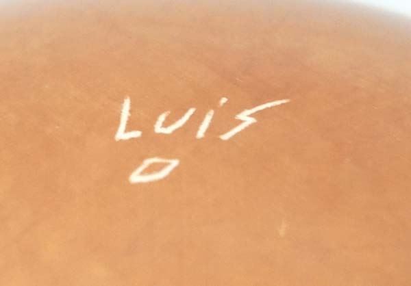 Large Mata Ortiz Eye Dazzler Jar by Luis Ortiz, measures 14''H x 9.5''D, signed by artist, highly burnished, stylized feathers