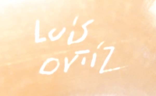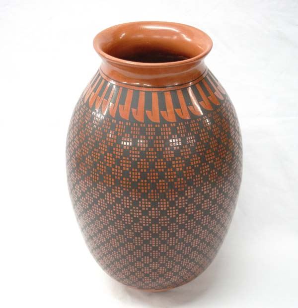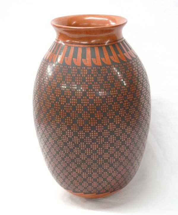 Large Mata Ortiz Eye Dazzler Jar by Luis Ortiz, measures 14''H x 9.5''D, signed by artist, flared rim and features stylized feathers around neck of jar