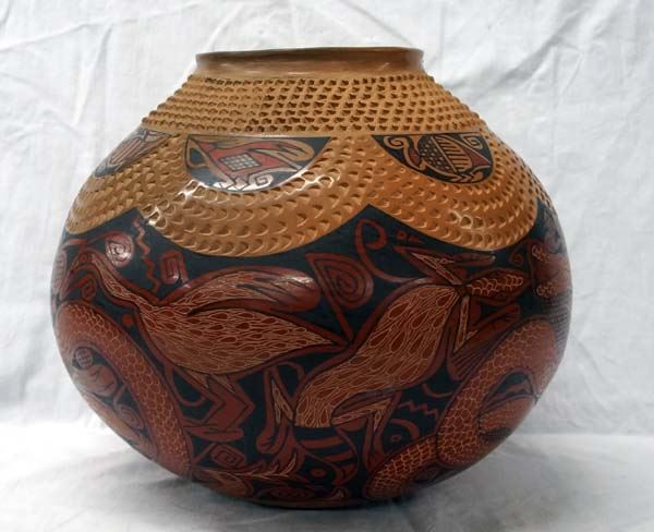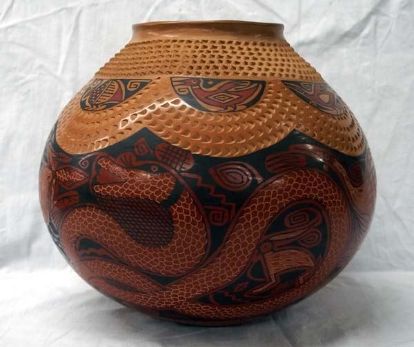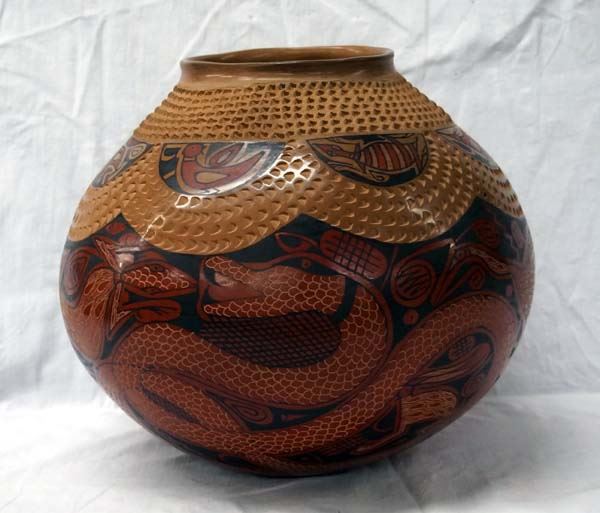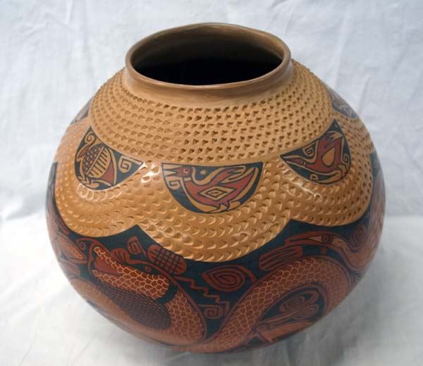 Phenomenal Mata Ortiz Polychrome Jar by Daniel Gonzalez, measures 11''H x 13''D, signed on bottom by artist, features rattlesnakes, lizards, and birds, textured rim, fabulous artwork on this piece