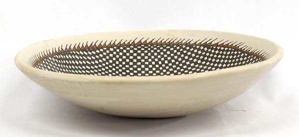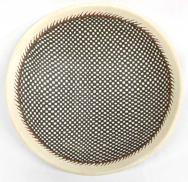 Large Mata Ortiz Pottery Bowl by Dora Quezada, checkerboard pattern, measures 3''H x 12.75'' and is signed on the bottom, Dora is the niece of Juan Quezada renowned Mata Ortiz Potter, flaking on rim (irregular)