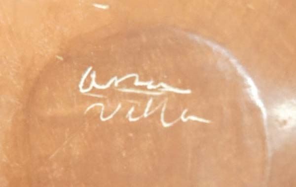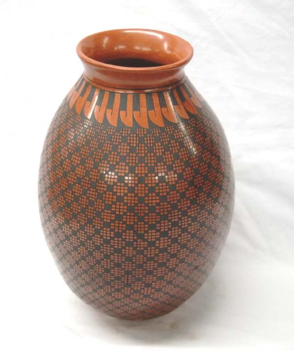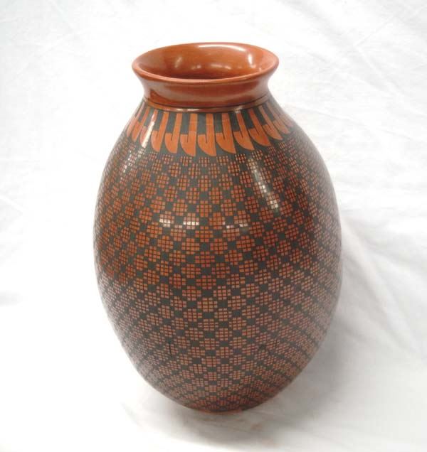 Large Mata Ortiz Eye Dazzler Pottery Jar by Anna Villa, signed by artist, stylized feather designs around neck, measures 14''H x 9.5''D