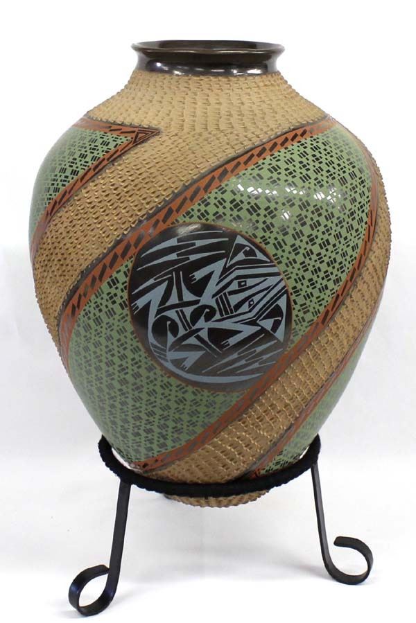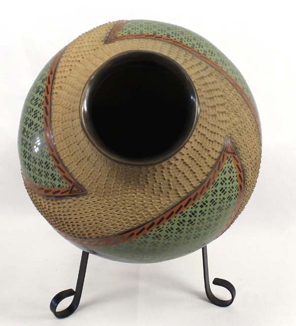 Large Mata Ortiz Textured Olla by Lucie Soto, highly burnished in certain areas, polychrome, lizard motif, signed on the bottom and measures 12'' x 15.5'', comes with yarn covered wrought iron stand, stunning piece, work intensive