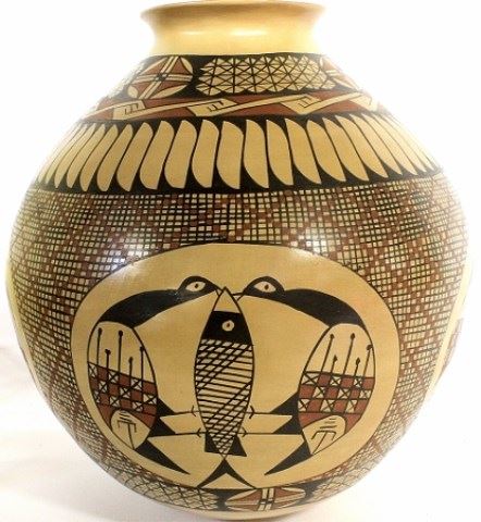 Bugarini with birds and fish, geometric and feather polychrome designs, impressive 17" tall X 16" diameter with no damage or chips. Est. 150-300