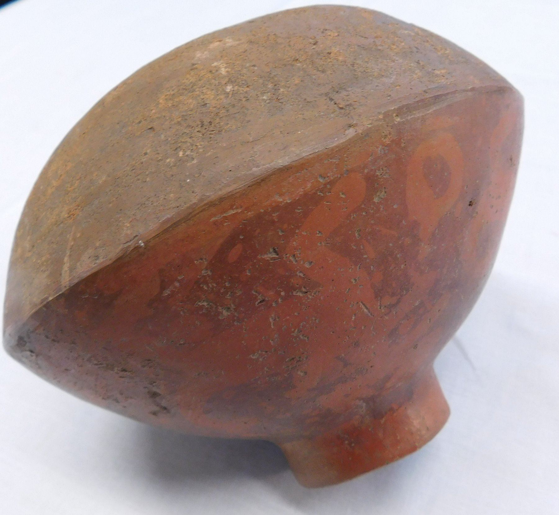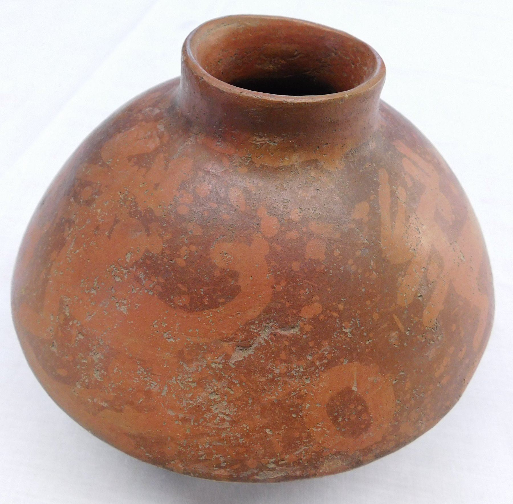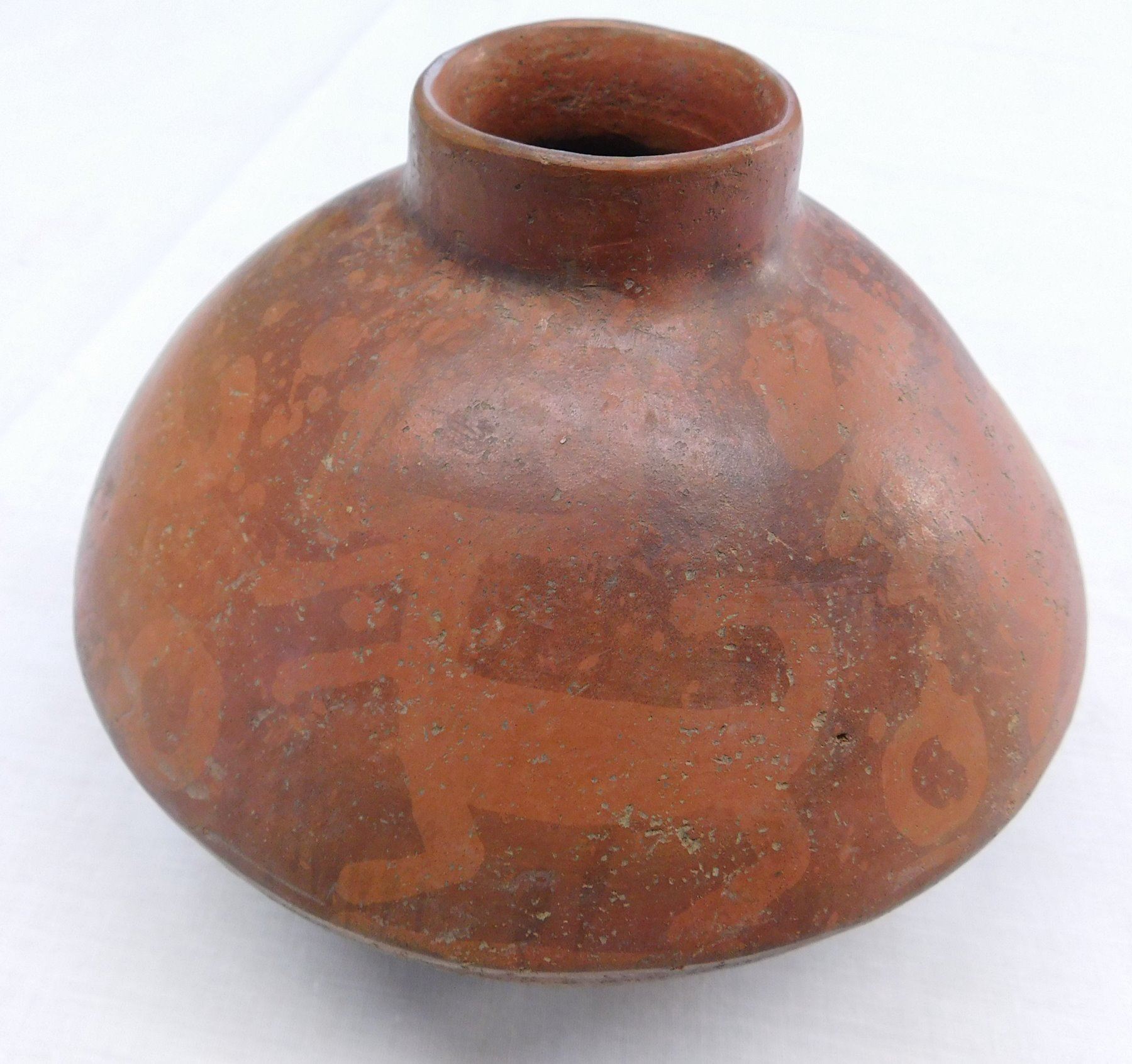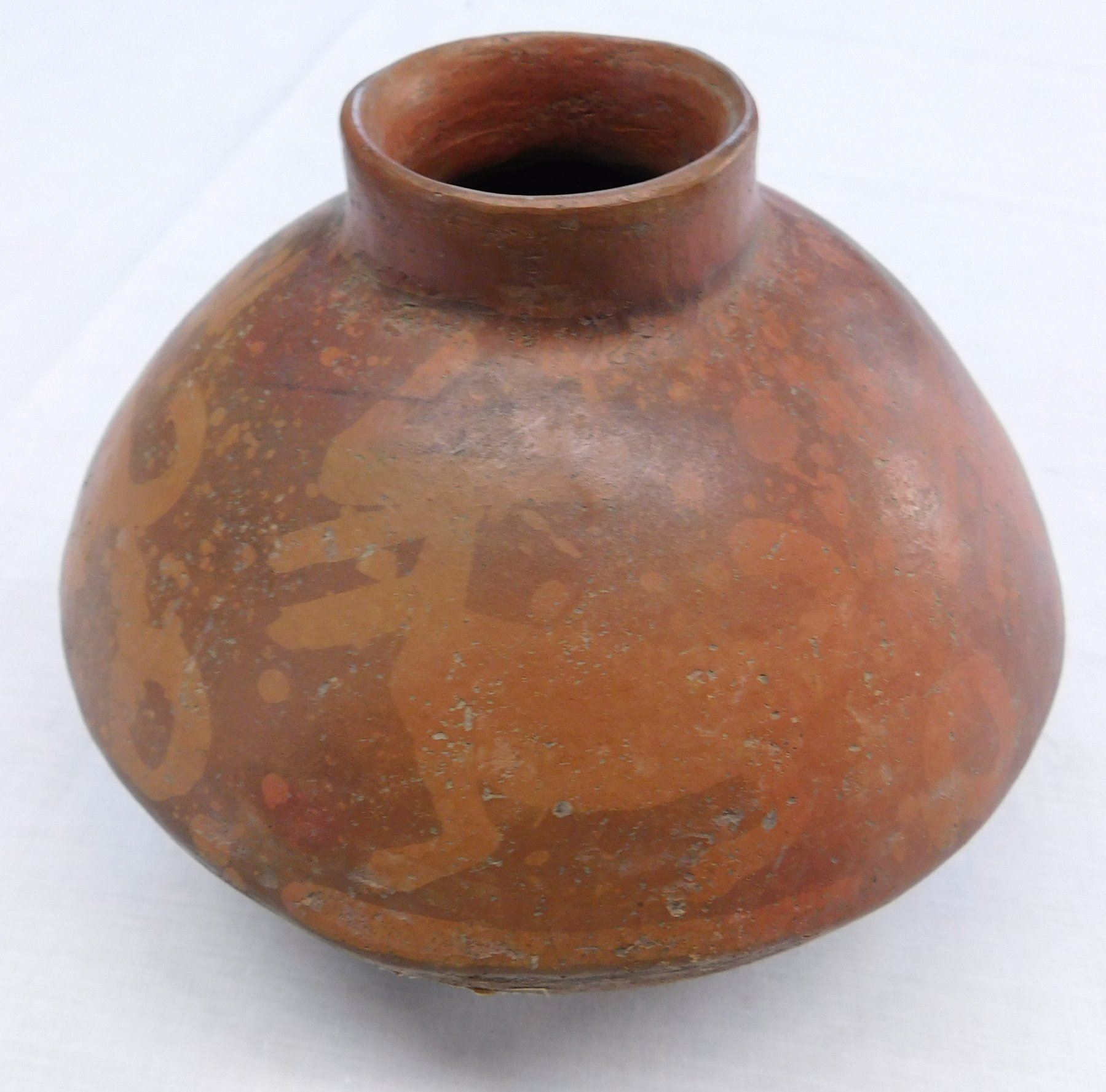 Large Mayan Figured Olla, pre-Columbian item. Made of clay and paint, the item measures 6 1/4" x 6 1/2" x 5". Guatemala. Fine figures on outside of olla. Condition: Good, see images. Shipping: $24.50 w/insurance and signature.