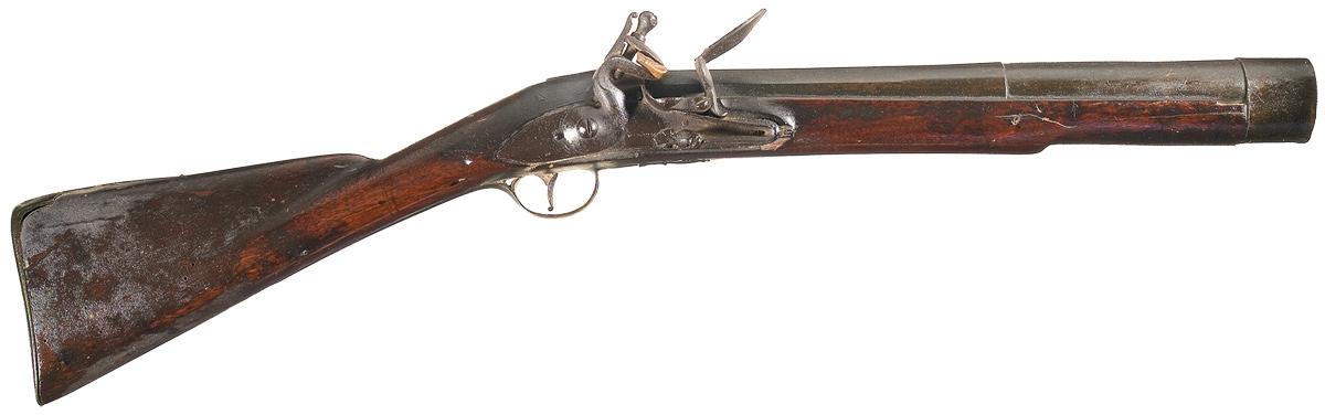 Condition: Good, with a thick, dark patina on the brass and pitting on the lock. The frizzen has been refaced. Stock is broken in the lock area, with cracking, chips and scuffs. Lockplate is slightly loose, but functions.