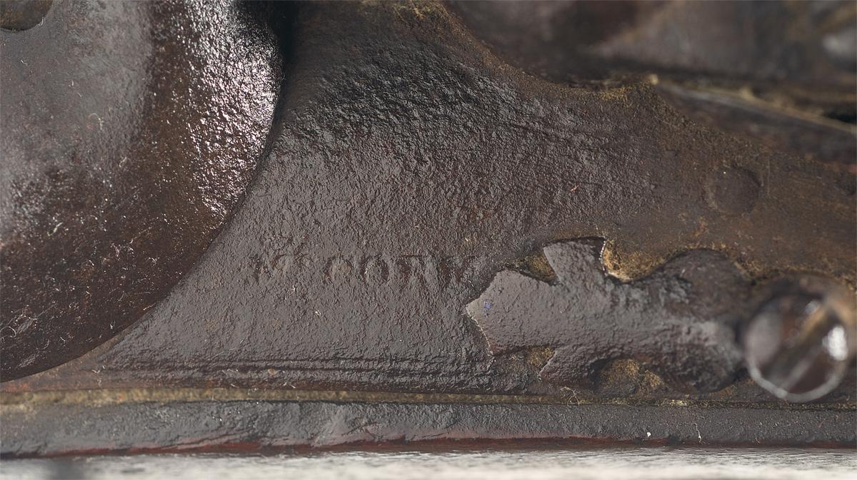 Produced without sights, with a 1 3/4" wide brass reinforcement band around the muzzle and stock tip and a set of faint proofs on the left side near the breech. The lock appears to be marked "McCORM" between the hammer and frizzen spring which butts up to the marking (could this be for McCormick with the "ICK" cut off?). Full length stock, with a brass reverse plate, trigger guard and buttplate. Three oval inset proofs are present at breech.