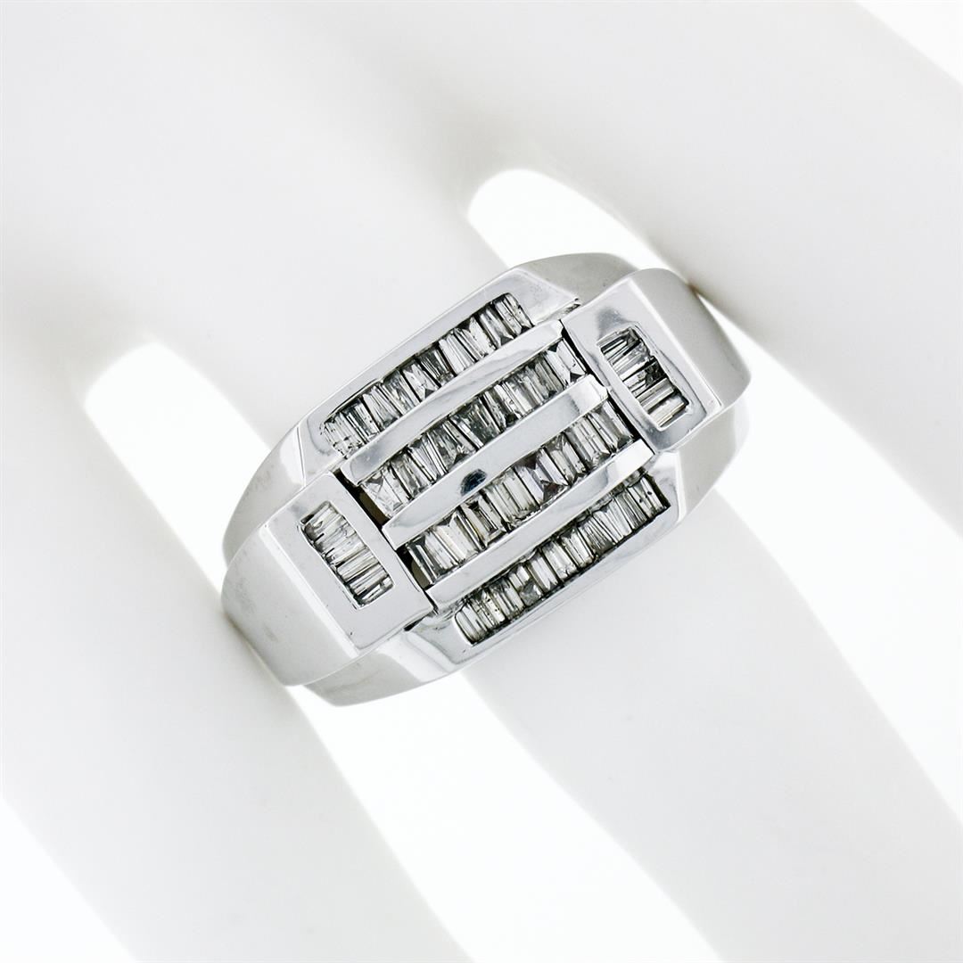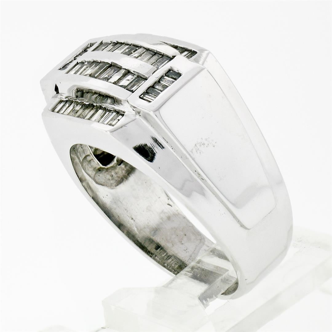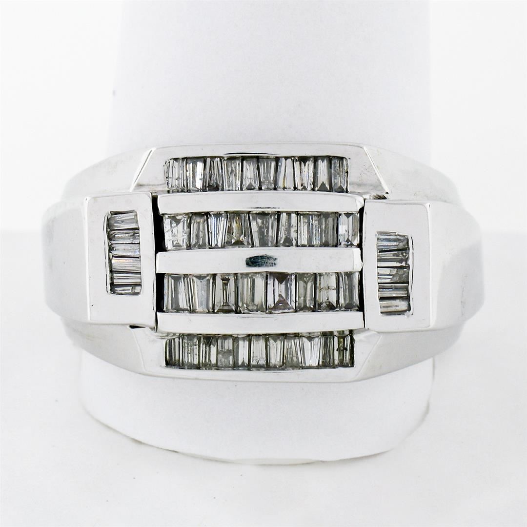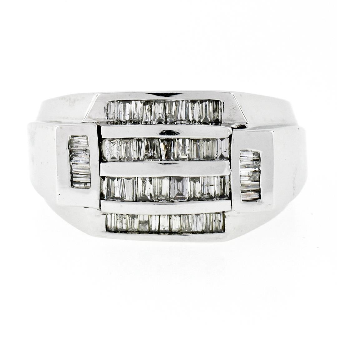 One Large Mens 14K White Gold 1.10ctw Tapered & Straight Baguette Diamond Band Ring. Item Details: Material: Solid 14K White Gold, Weight: 16.69 Grams, Stone(s): (49) Natural Genuine Diamonds - Tapered & Straight Baguette Cut - Channel Set - SI2/I1 Clarity - J/K Color - 1.10ctw (exact), Ring Size: 11.0 (We can custom size this ring.), Ring Width: 13.50mm (top of the ring), 5.50mm (bottom of the shank), Ring Height: 6.35mm rise off the finger, Condition: Like New!