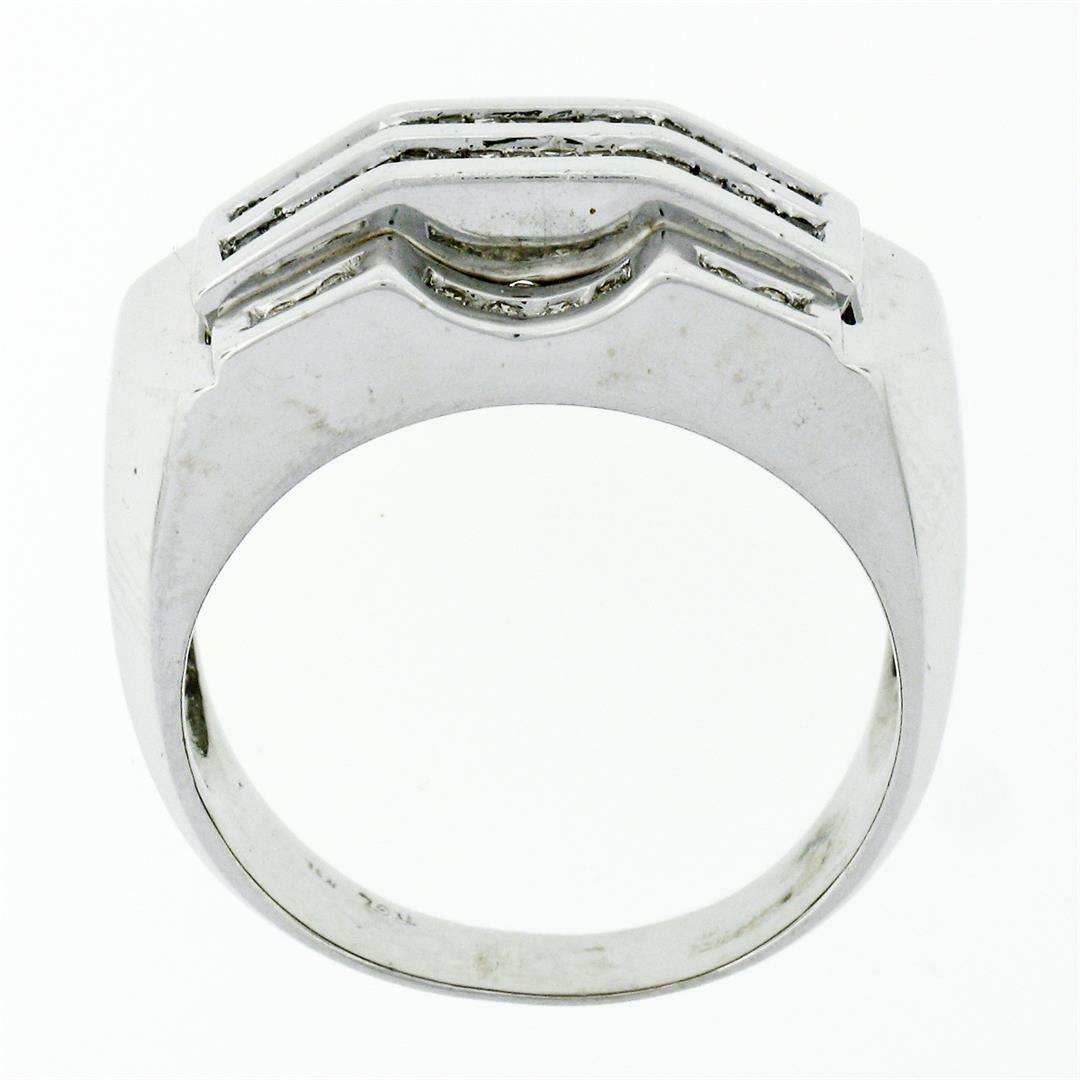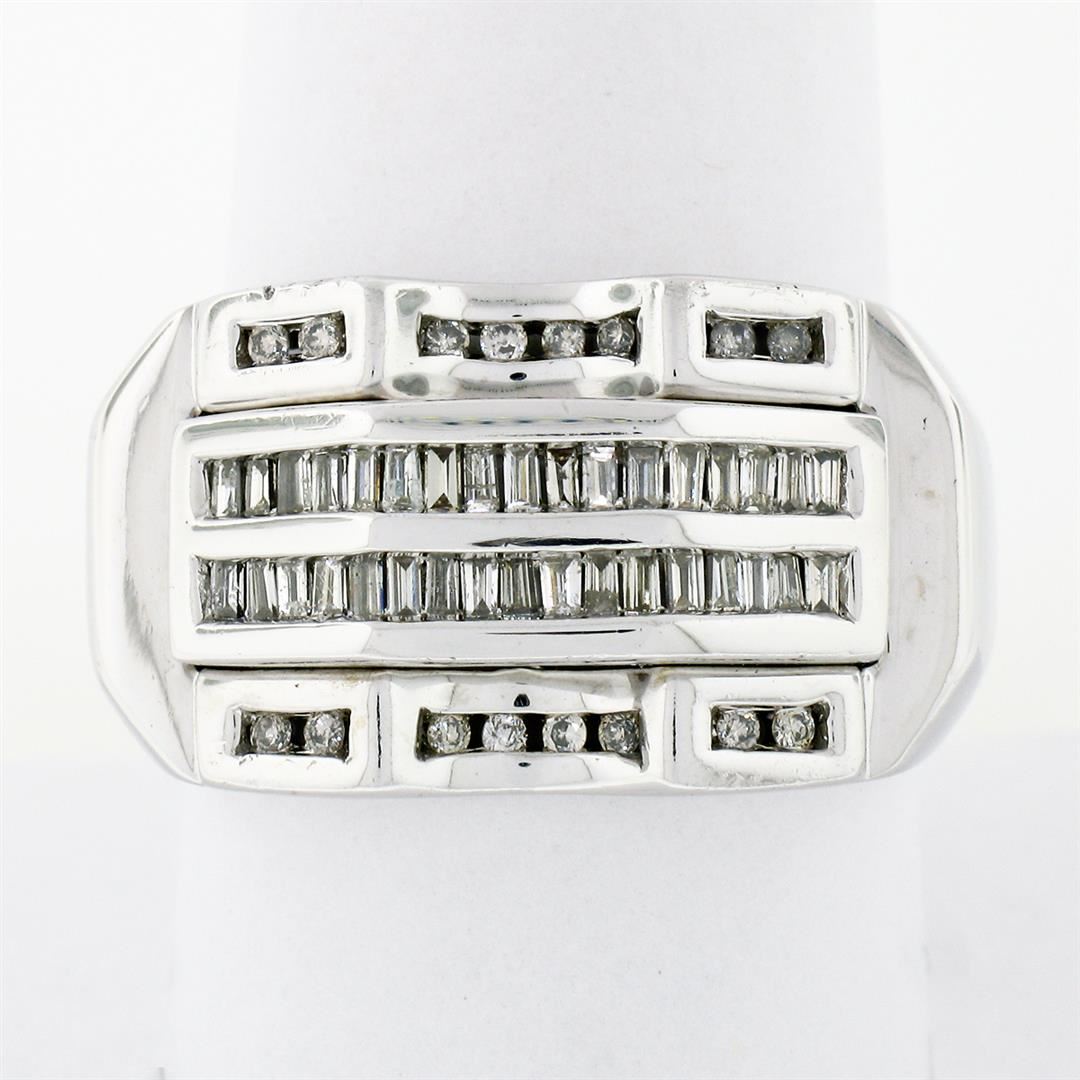 One Large Mens 14K White Gold .90ctw Round & Baguette Diamond Wide Channel Band Ring. Item Details: Material: Solid 14K White Gold, Weight: 11.57 Grams, Stone(s): (34) Natural Genuine Diamond - Baguette Cut - Channel Set - SI2/I1 Clarity - I/J Color - 0.65ctw (approx.), (16) Natural Genuine Diamond - Round Brilliant Cut - Channel Set - SI1 Clarity - J/K Color - 0.25ctw (approx.), Total Carat Weight: 0.90 (approx.), Ring Size: 10.0 (We can custom size this ring.), Ring Width: 13.55mm (top of the ring), 4.65mm (bottom of the ring), Ring Height: 6.25mm rise off the finger, Condition: Like New!