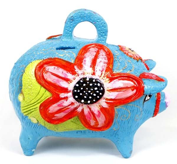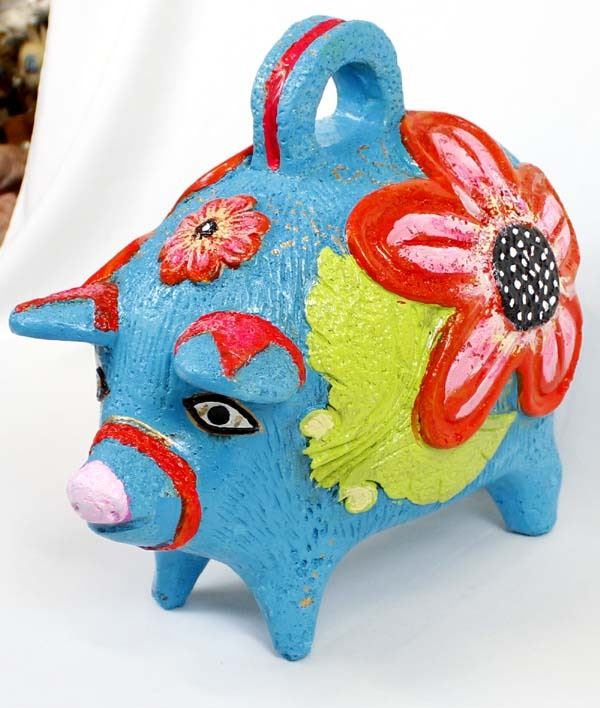 Large Mexican Chalkware Piggy Bank, measures 14'' x 15'', does not have rubber stopper, beautiful vibrant colors