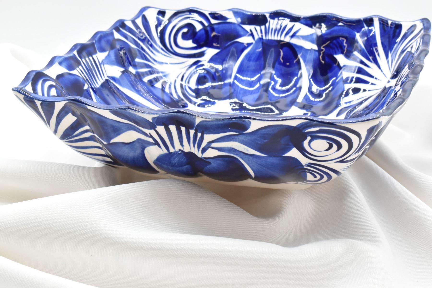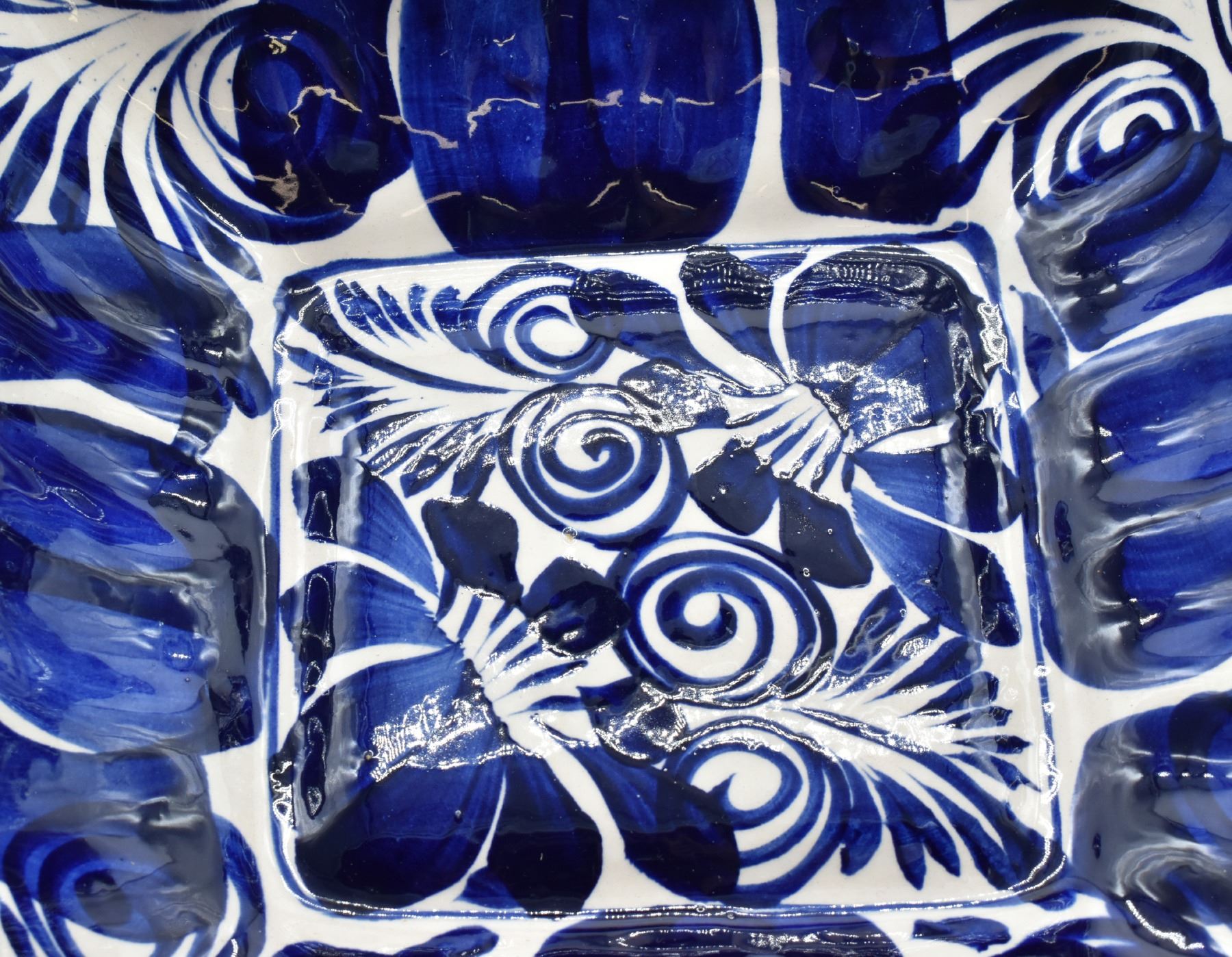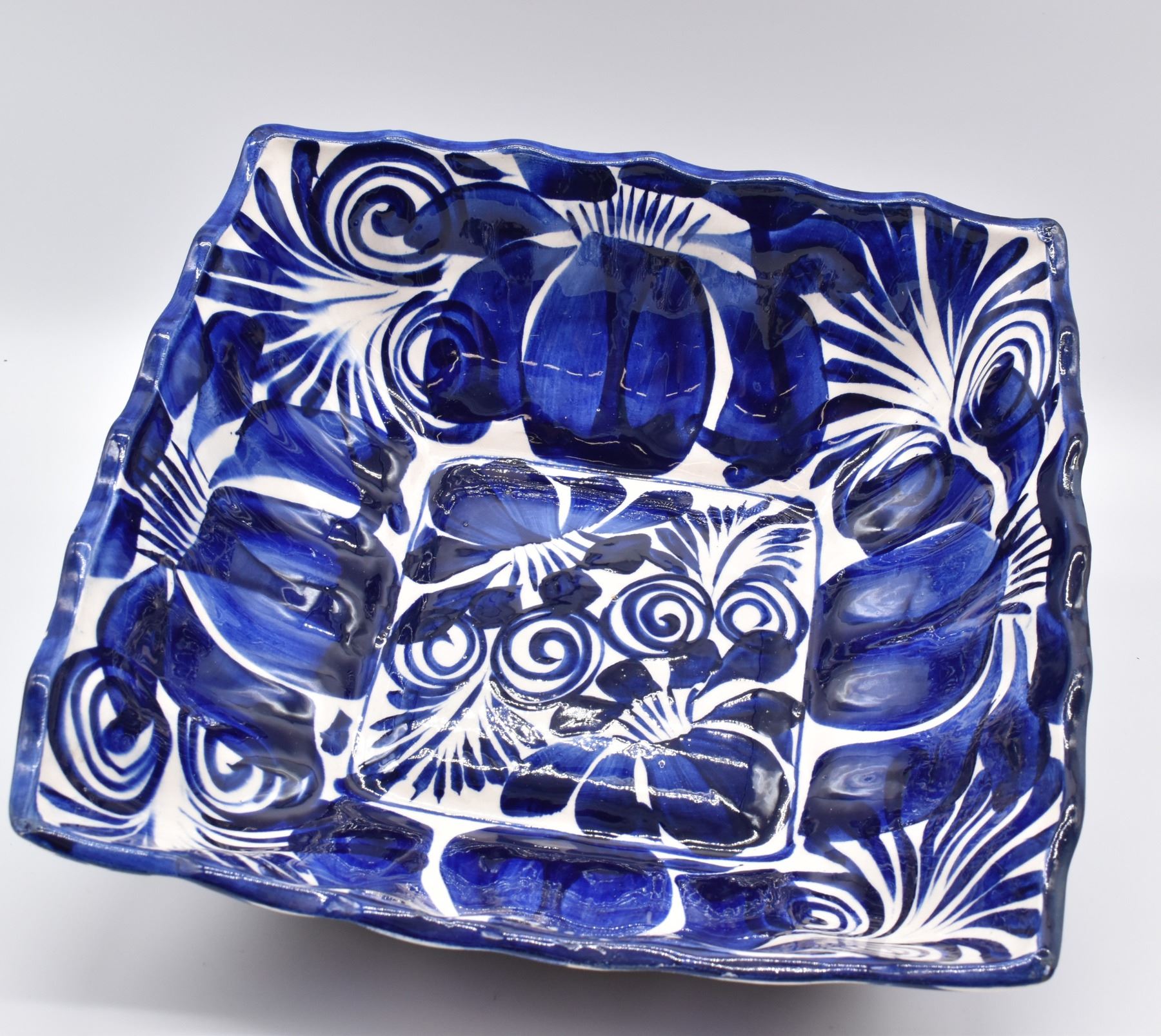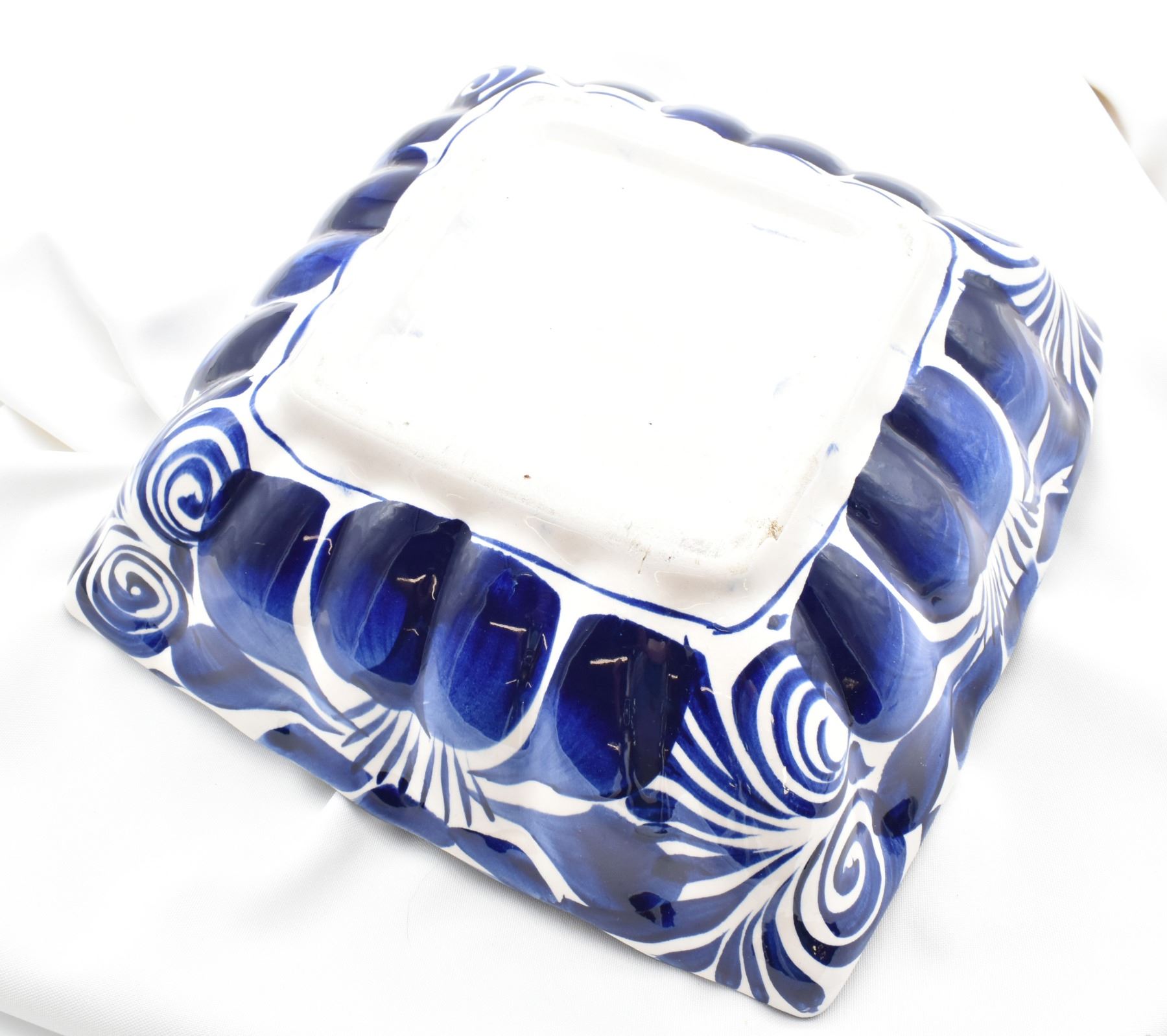 Large Mexican Cobalt Blue and White Pottery Serving Bowl, measures 11.5'' square, fluted rim