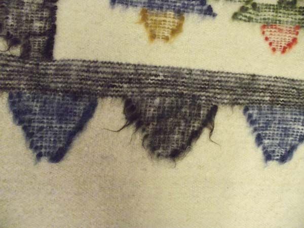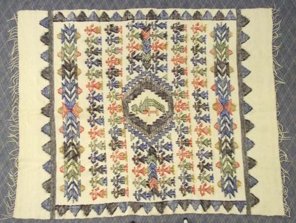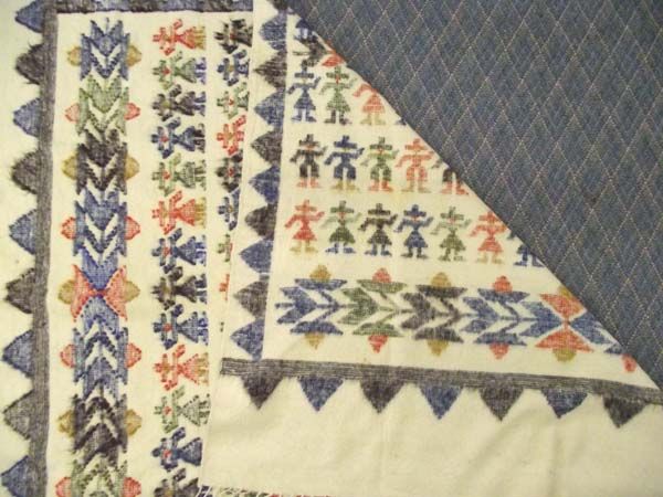 Large Mexican Made Figural Blanket. Measuring 62''Wide by 80''L, this blanket is in very good condition with nice colors. One very small hole, but must look to find it.