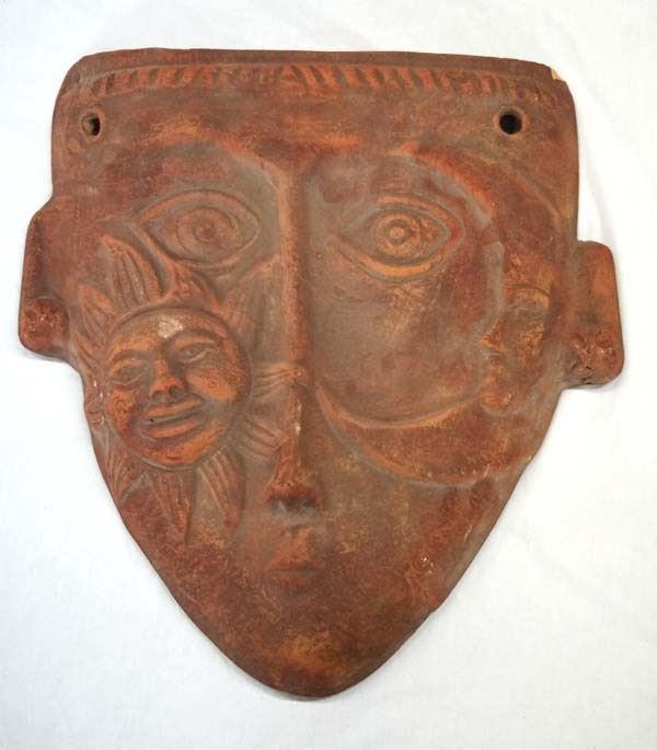Large Mexican Pottery Mask, measures 19''L x 20'', has chip on top