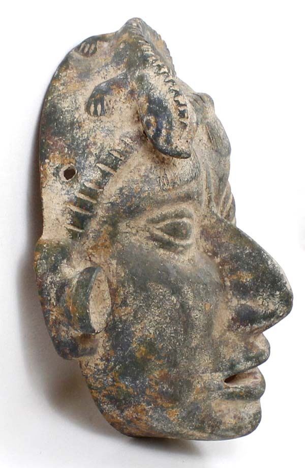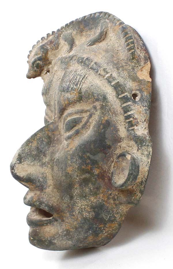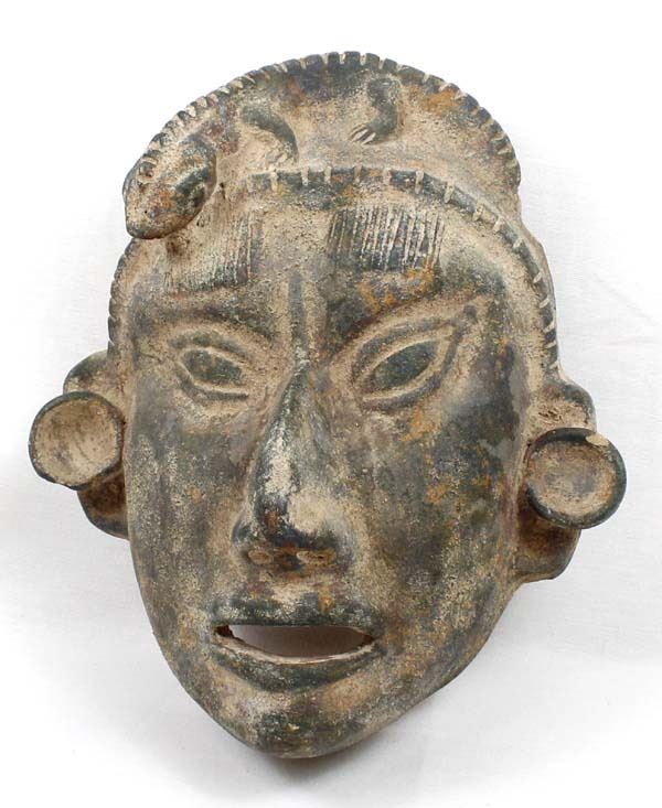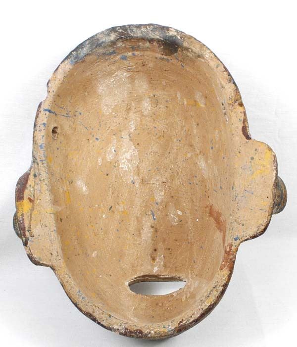 Large Mexican Pottery Mask, measures 11'' x 13'' x 5'', has chip below lizard's tail and on left ear disc