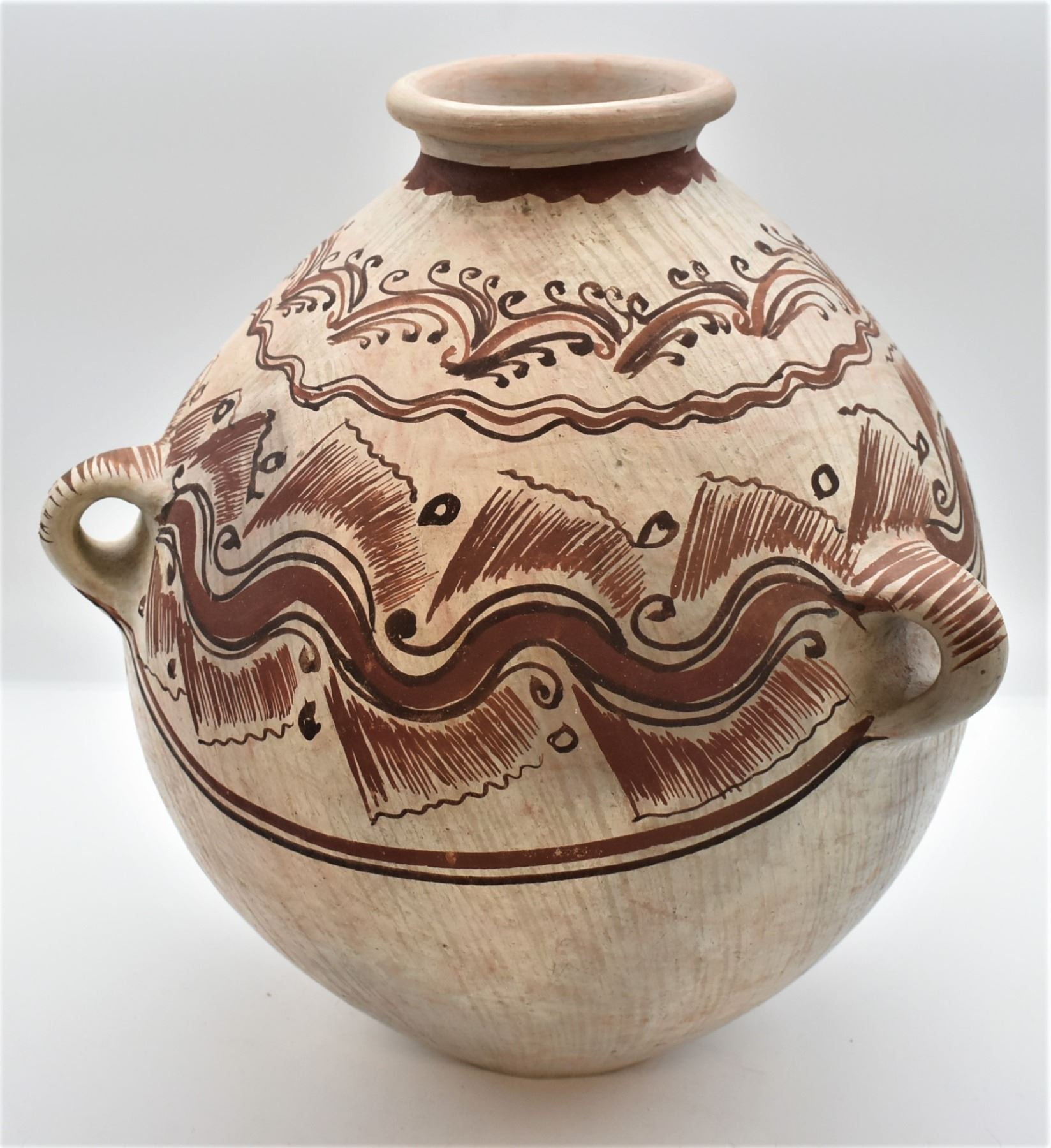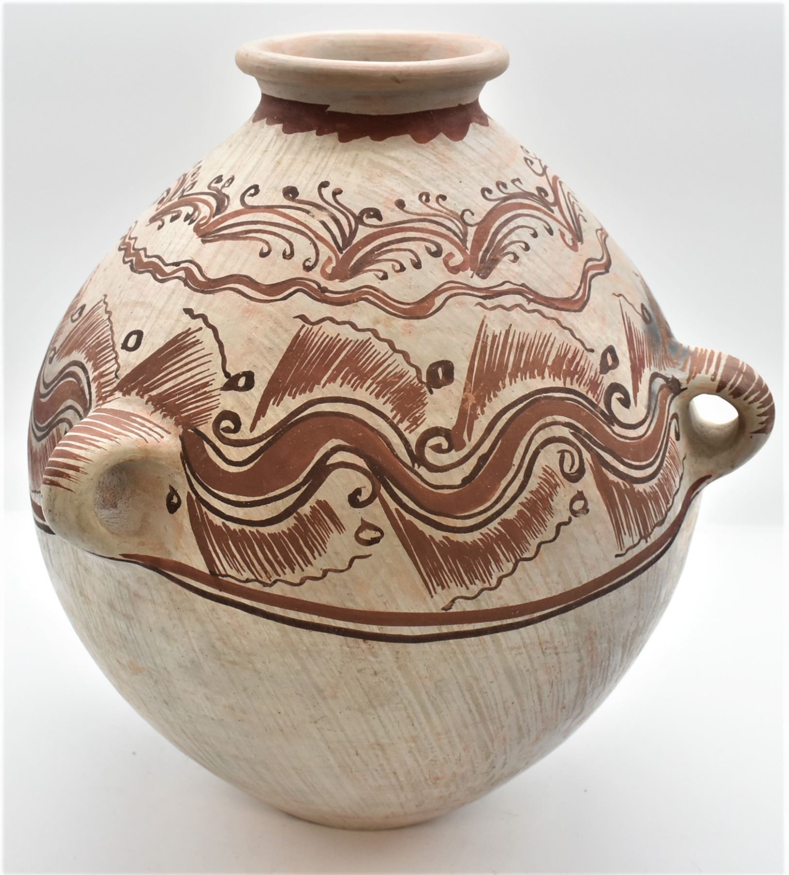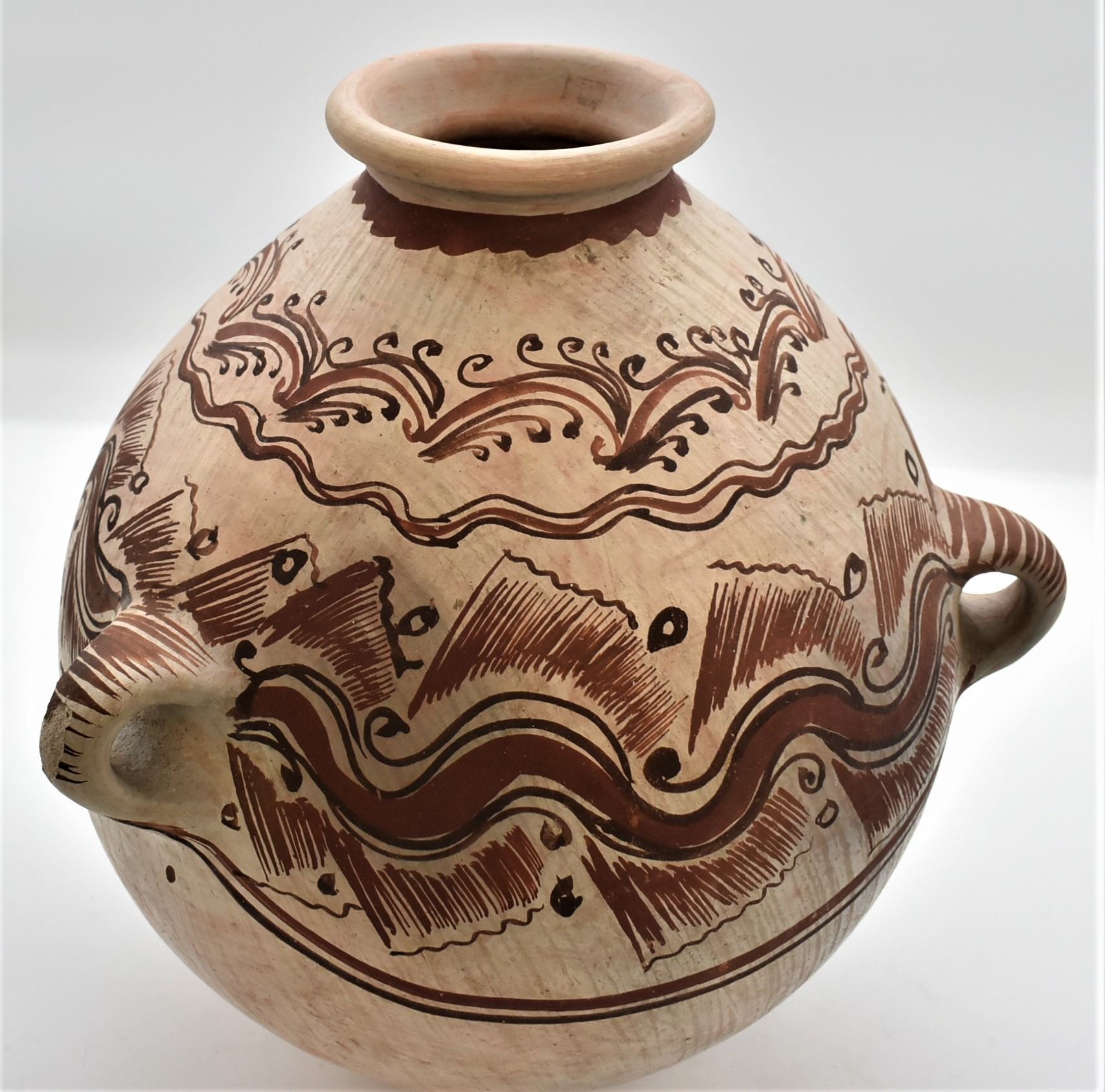 Large Mexican Pottery Olla with 3 Handles, measures 12'' x 13'', marked Mexico on the bottom, hand painted, beautiful piece