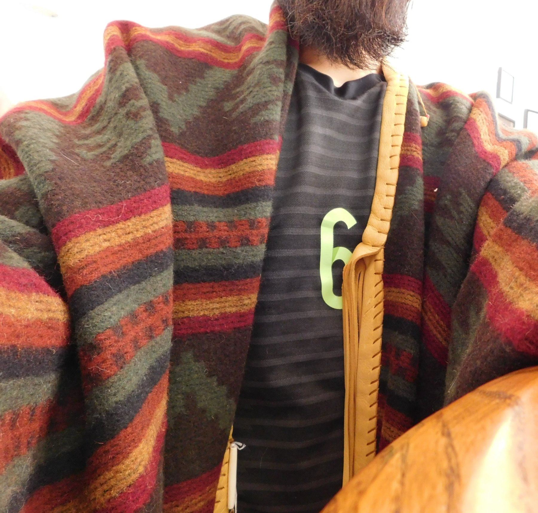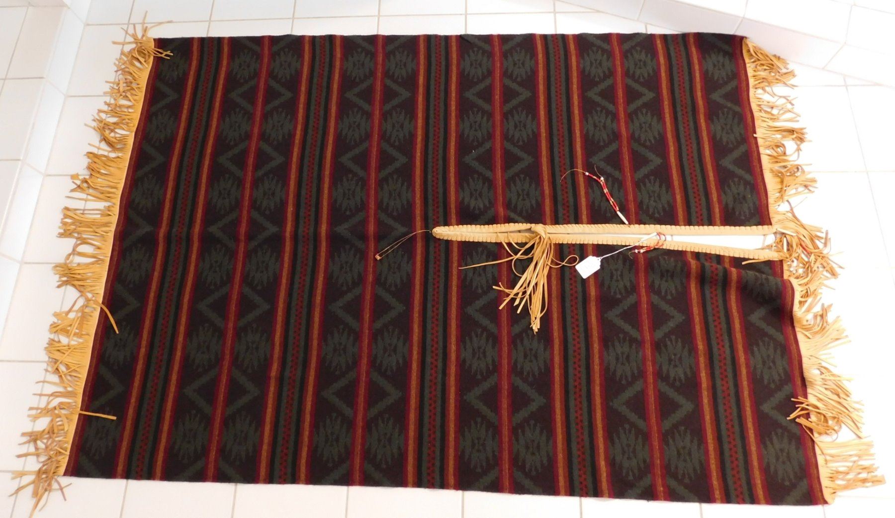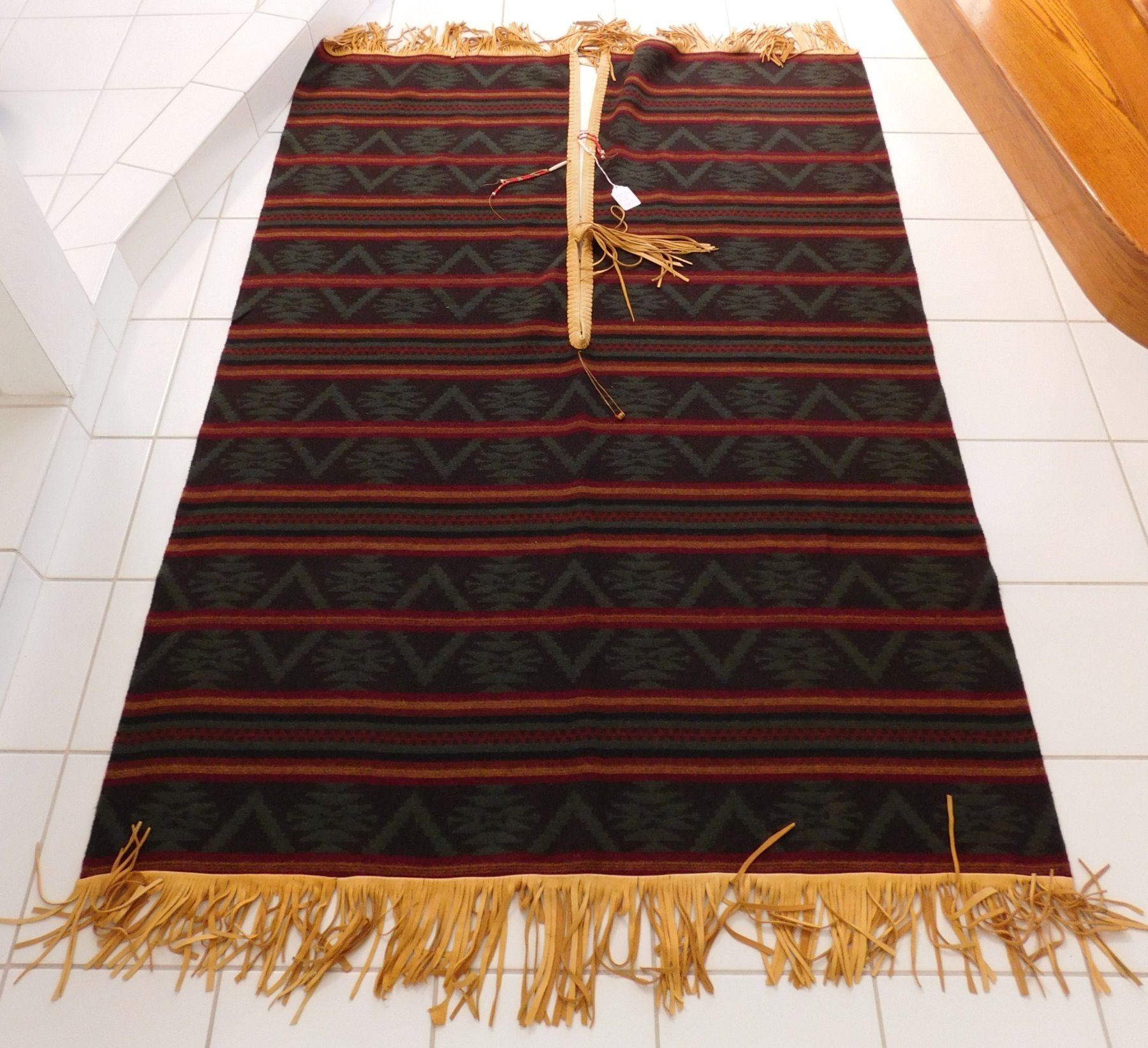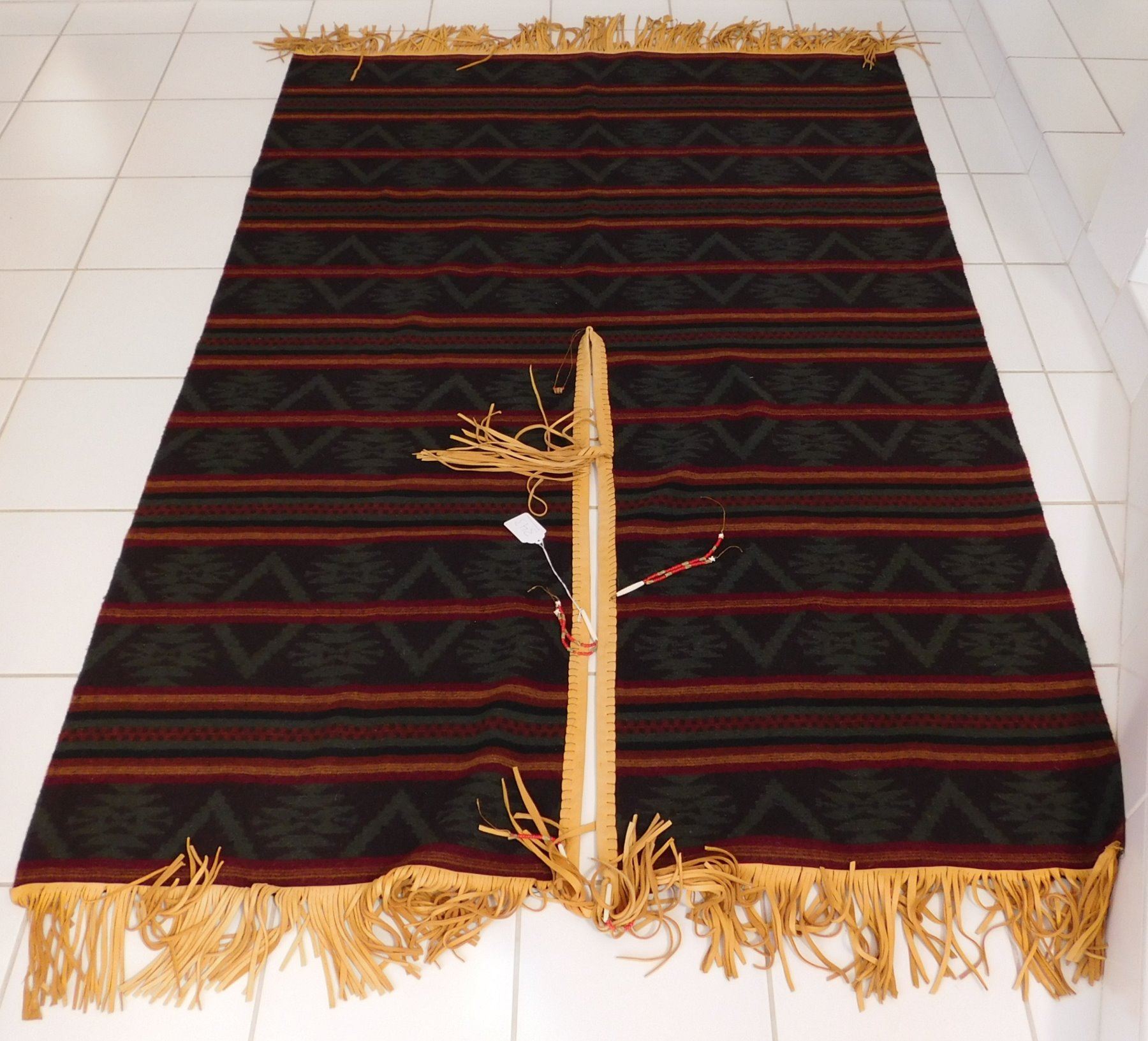 Large Mexican Serape, circa 1980s. Made of wool, cotton, bone, glass beads and leather, the item measures approx. 95" x 60". Central Mexico. Very fine with extra work all over, very warm! Would fit a tall person well. Condition: Very good, see images. Shipping: $32.50 w/insurance and signature, due to size and weight.