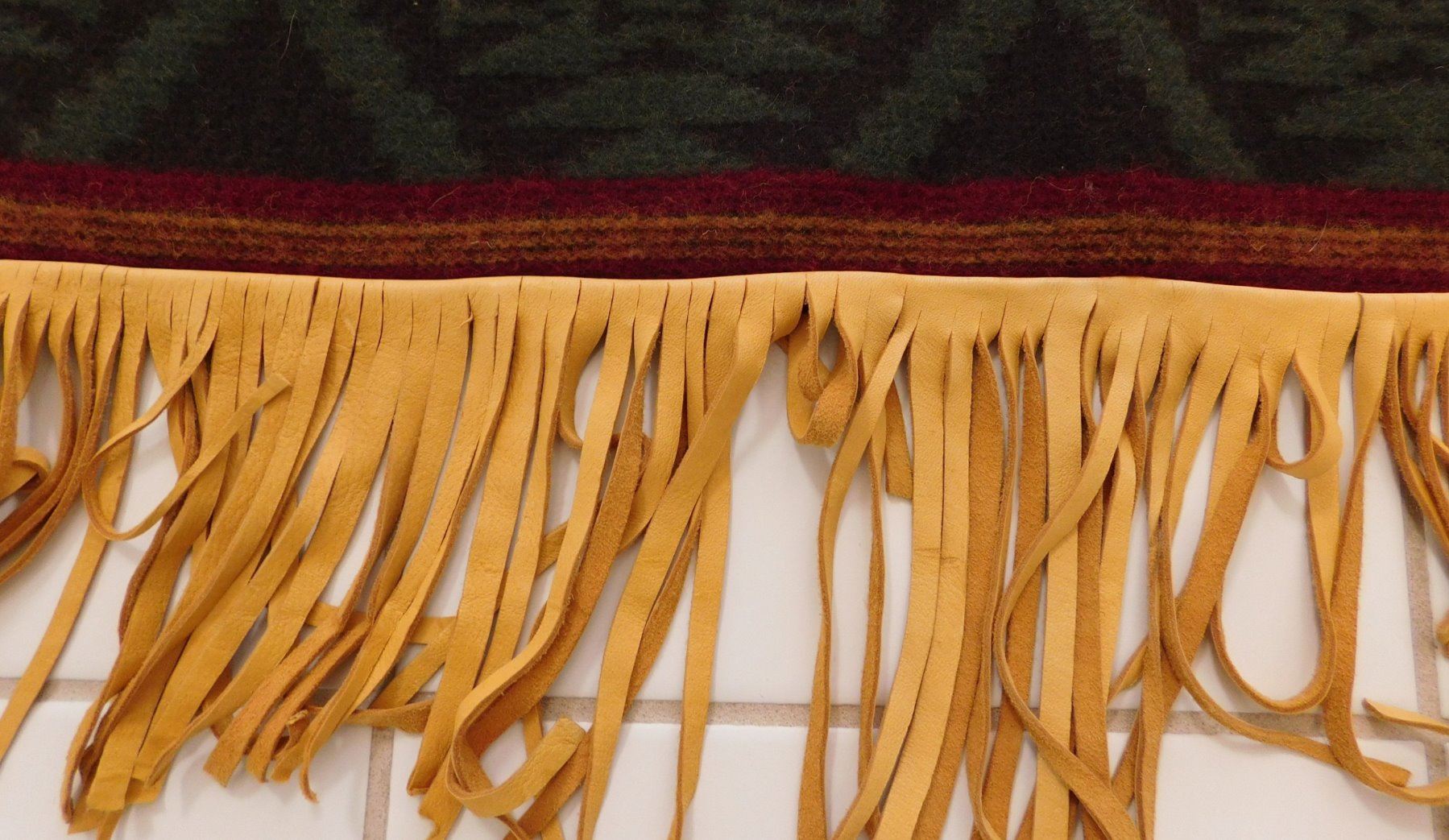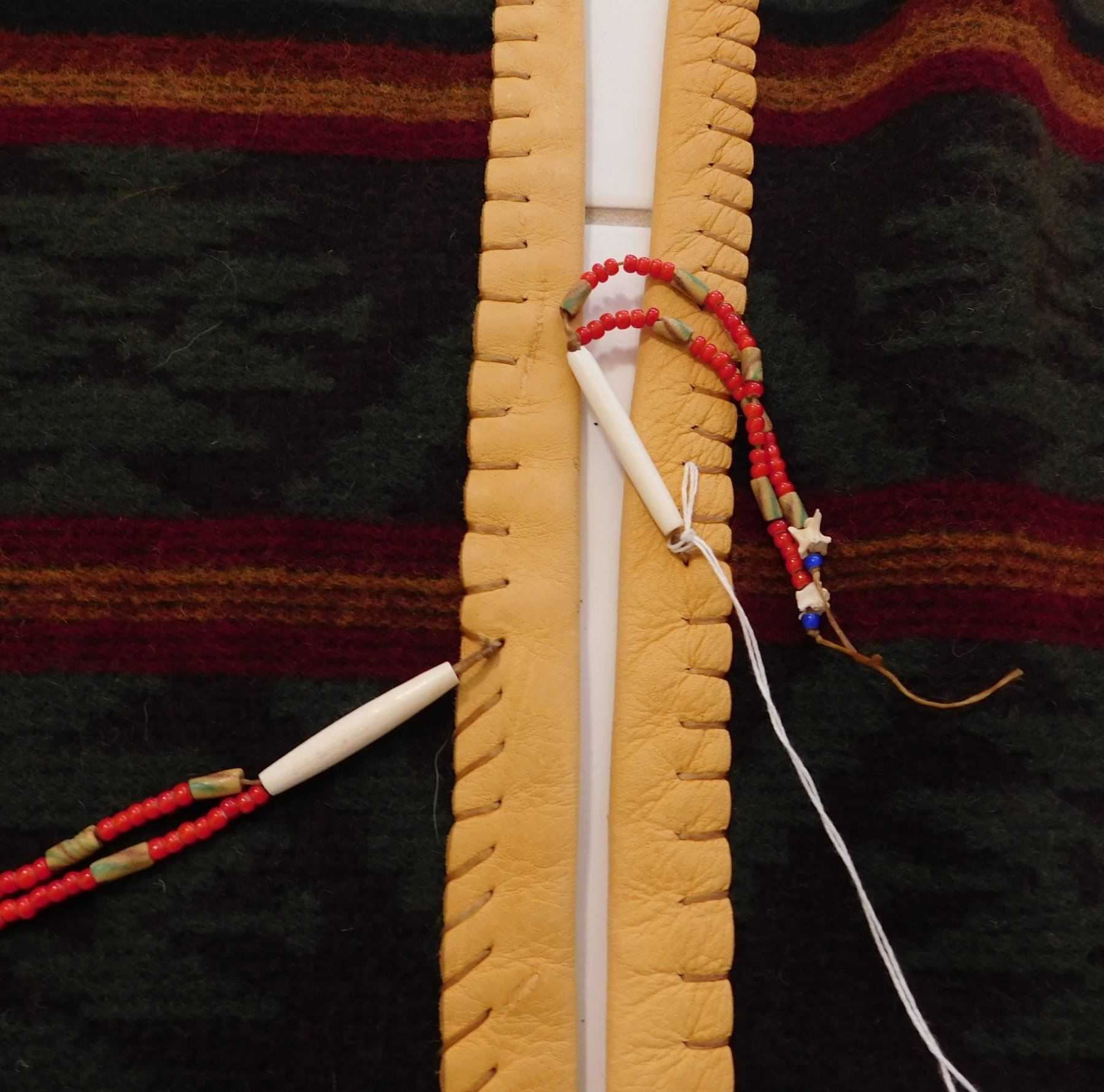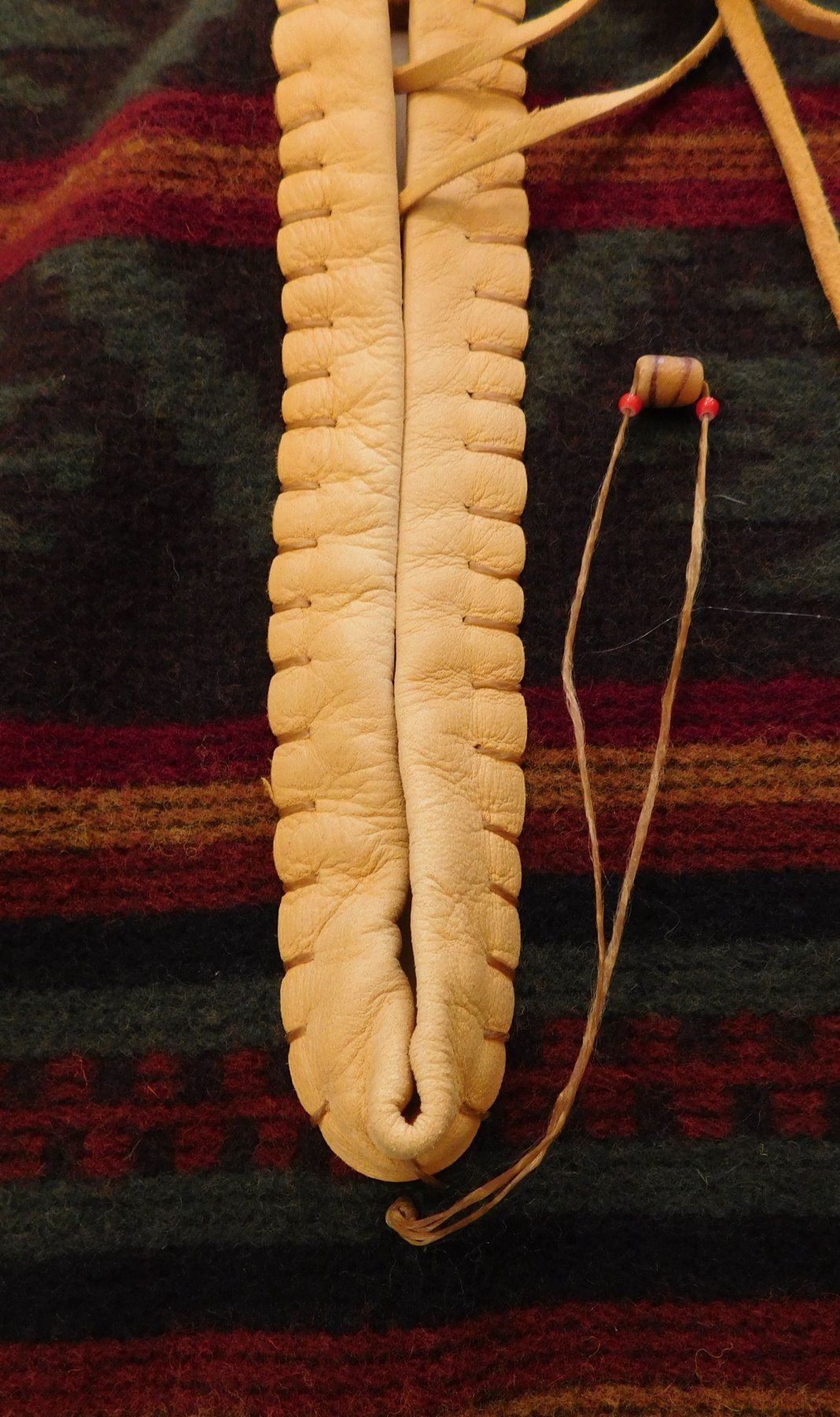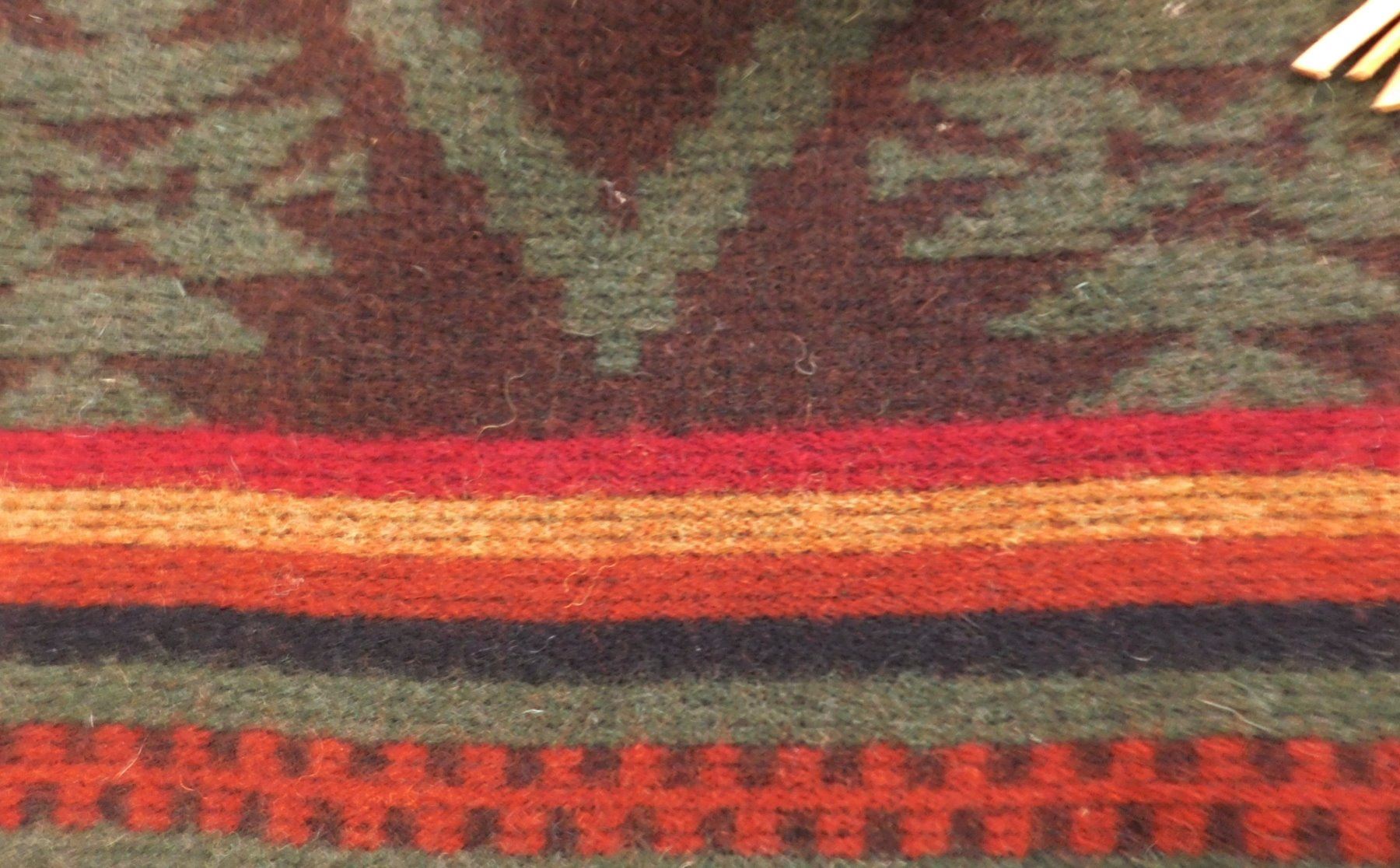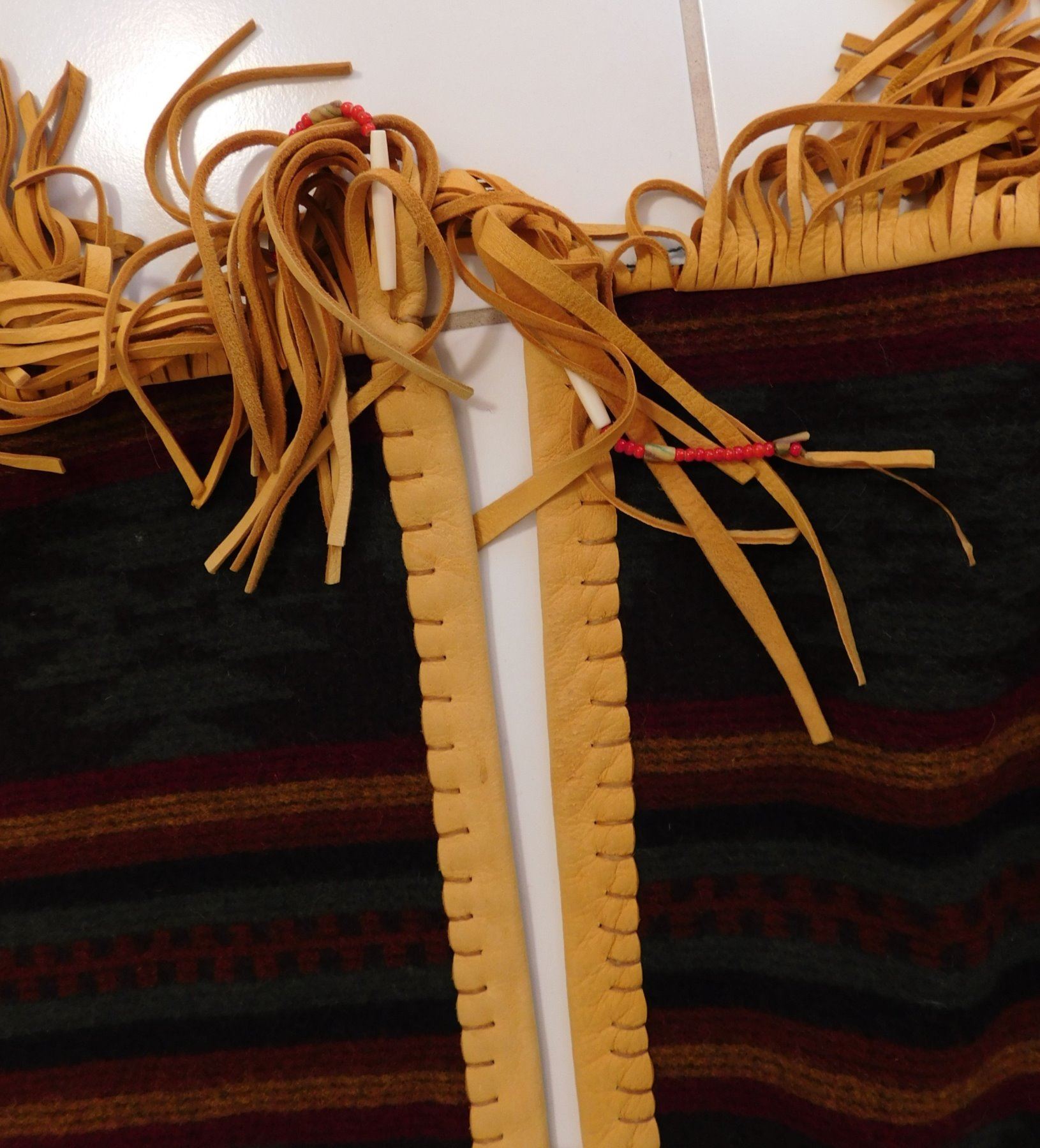 Large Mexican Serape, circa 1980s. Made of wool, cotton, bone, glass beads and leather, the item measures approx. 95" x 60". Central Mexico. Very fine with extra work all over, very warm! Would fit a tall person well. Condition: Very good, see images. Shipping: $32.50 w/insurance and signature, due to size and weight.