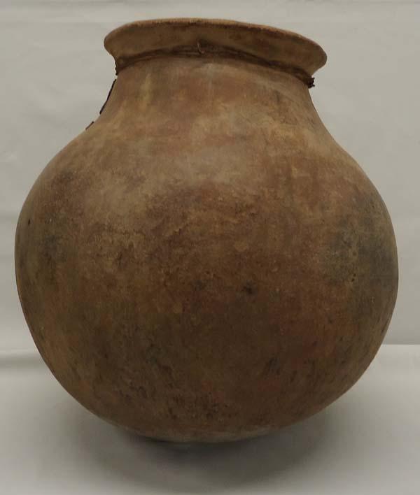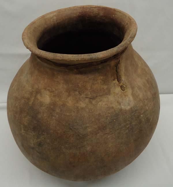 Large Mexican Utilitarian Pot. Has pressure crack on outside and on rim. Measures approx. 13 1/2''H x 14''W. SHI $100.