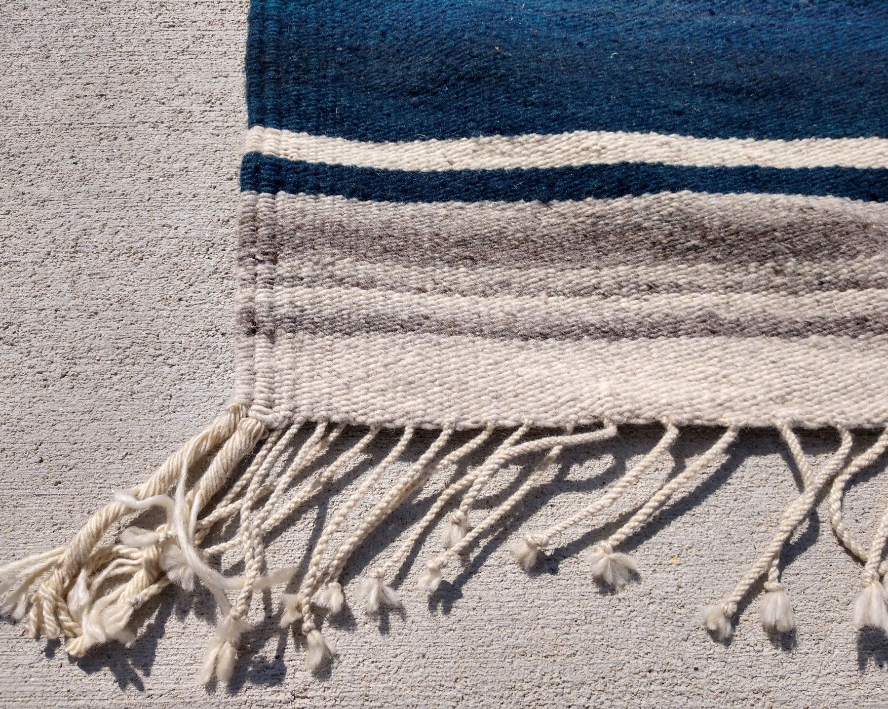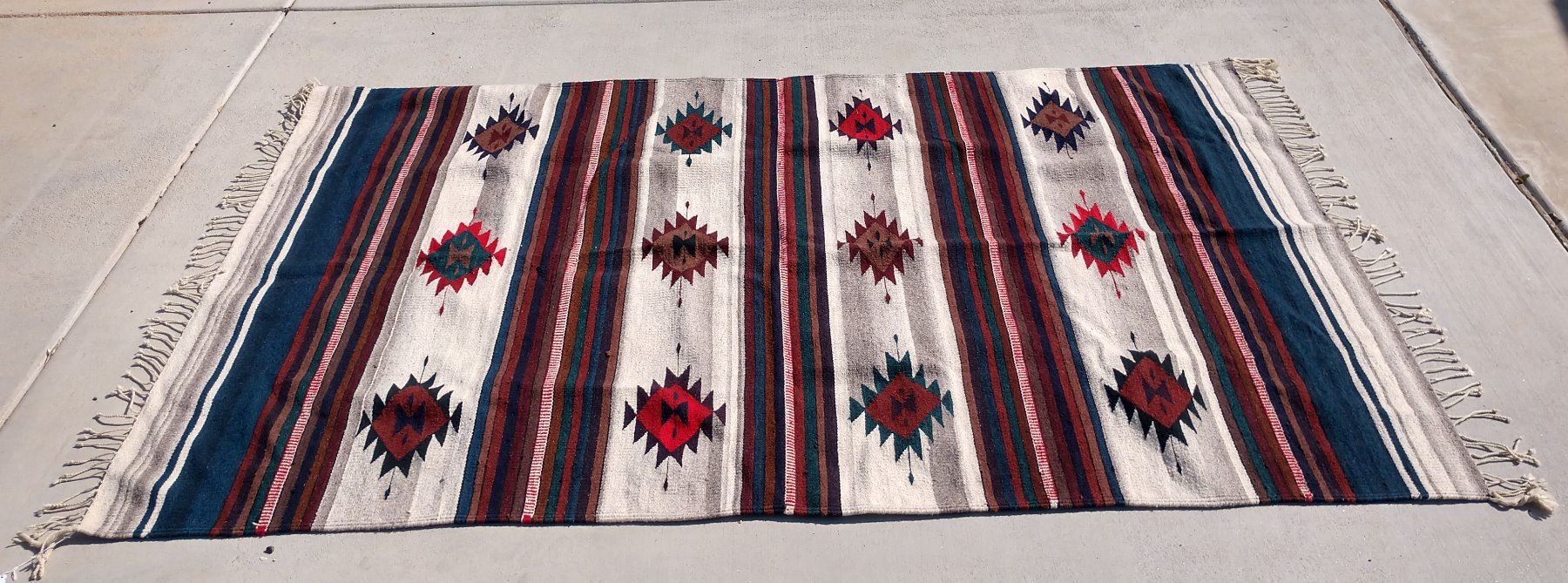 Large Mexican Weaving, c. 1950s. Made of wool and cotton, the item measures 56" x 92". Mexico. Very colorful, beautiful weaving. Condition: Good, see images. Shipping: $30.00 w/insurance and signature.