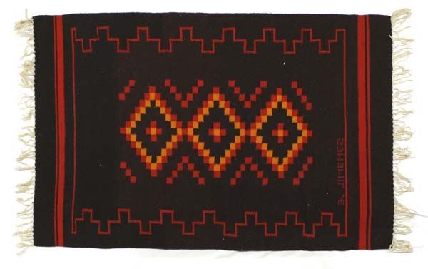 Large Mexican Wool Textile Rug, fringed on both ends, measures 33'' x 50'', stunning colors, has the name G. Jimenez on it (not sure if this is the artist or owner)