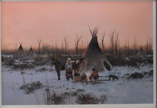 Large Michael Coleman color print entitled “Milk River Camp” depicting Indians in winter camp, approx. 18” x 26-1/2” and contained in a protective heavy cardboard tube, ready for framing. Coleman is one of America’s mostnoted award winning Western artists and this is one of his classic works. Est.: $50-$75.