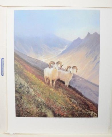 Large Michael Coleman color print entitled “Old Timers” showing two mountain sheep, approx. 23-1/2” x 18-1/2” and in a heavy protective cardboard tube, ready for framing; also accompanied by a Professional Hunter’sAssociation 1987/88 stamp of the image. Coleman is known for his work with game animals, Western and Native American subjects. Est.: $50-$75.