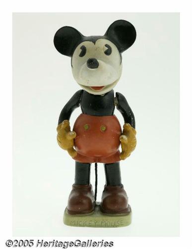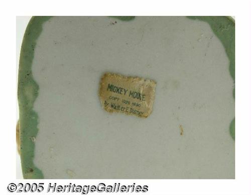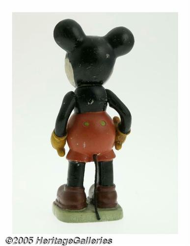 <B>Large Mickey Mouse Bisque Figurine (Walt E. Disney, c. 1934-36).</B></I> The largest Mickey Mouse bisque figurine produced, standing a majestic 9.5" tall. Both arms are movable, and the tail is still present. Made in Japan, with an original label on the bottom of the base. Some minor paint loss, but it remains a very attractive example. <I>From the Larry Jacobs Collection.</B></I>