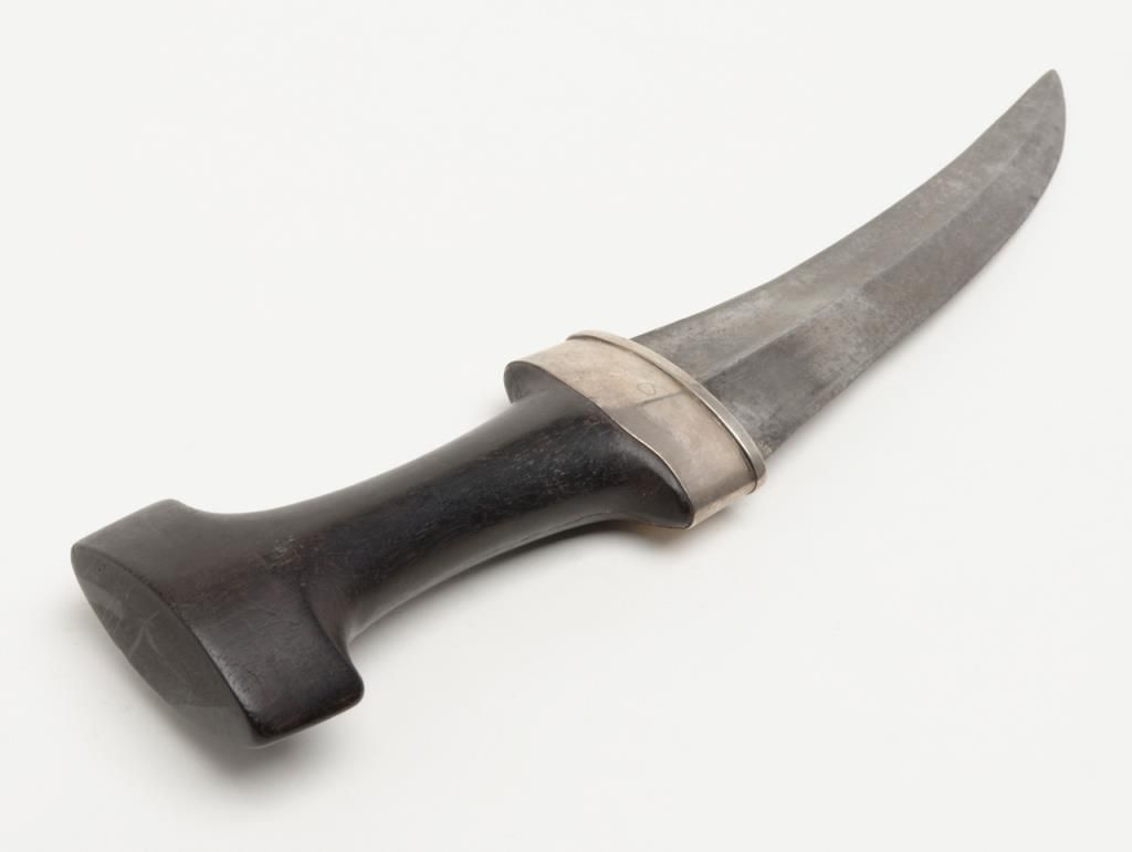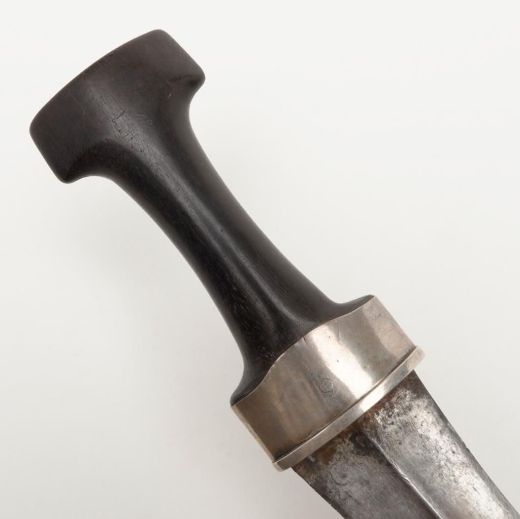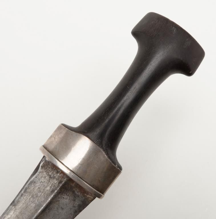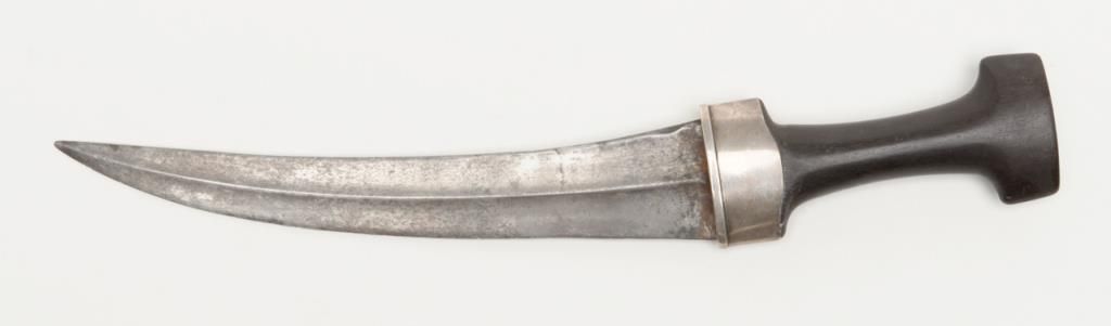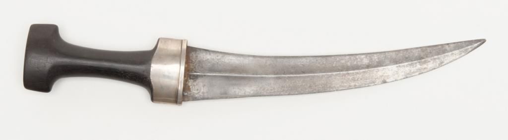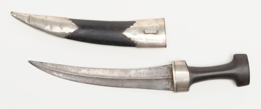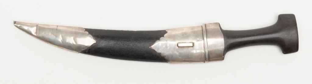 Large Mid-eastern silver mounted curved blade knife with sheath, approx. 16” overall with a 10-3/4” blade, hardwood grip and wooden sheath wrapped with blackened leather and displaying silver throat and tip matching the silver cover at the bottom of the knife’s grip. The knife is overall very good; the sheath good to very good with an area of leather loss on the right lower side toward the back of the silver tip which shows some denting; not a tourist piece and of a highquality of workmanship. Est.: $1,500-$3,000