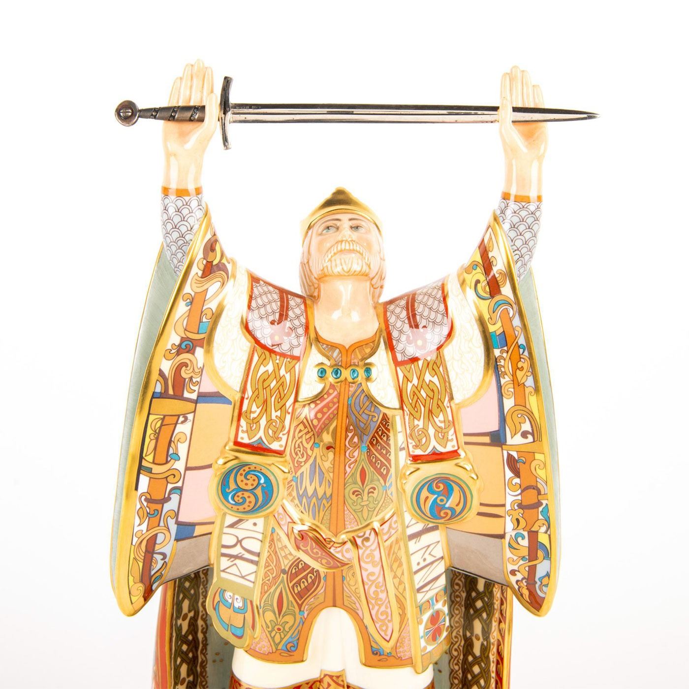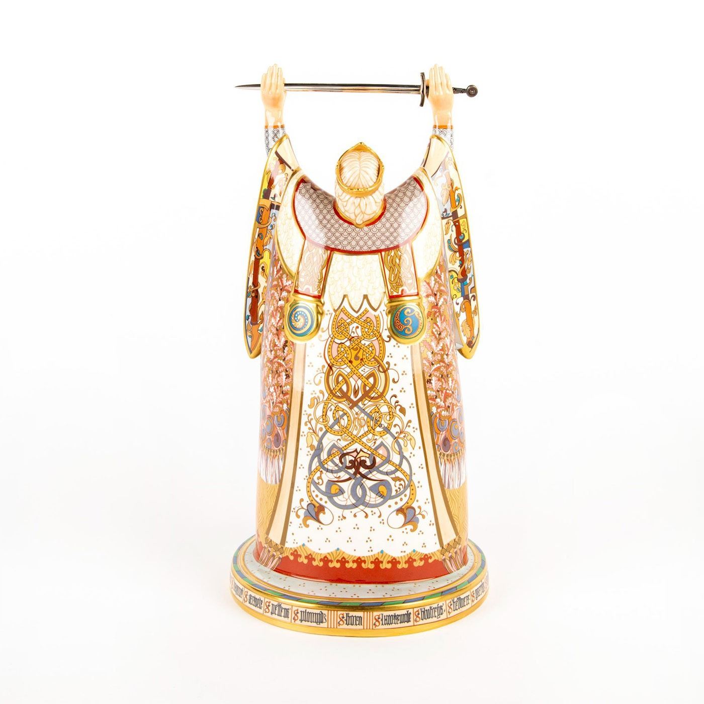 First in a collection of three figures. Polychrome figure, gilt highlights. Hallmarked silver sword. Minton backstamp.